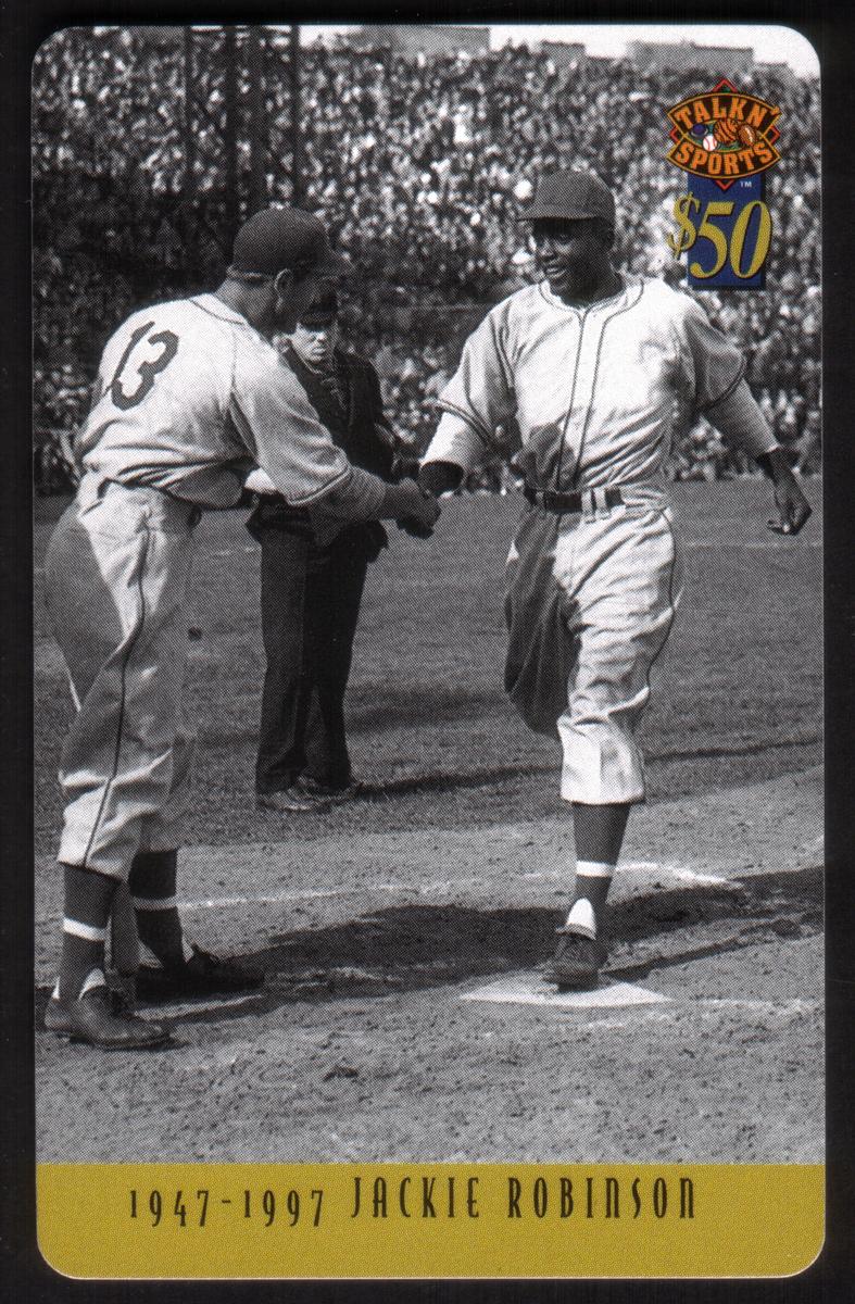 The card includes elements associated with baseball such as bats and baseballs, linking it clearly to the sport. The text highlights "Brooklyn Dodgers" and "Jackie Robinson (#3 of 5)," indicating it is part of a limited edition series featuring Robinson. The top of the card references "Talk N' Sports $50," suggesting a connection to a collectible or sports memorabilia value.