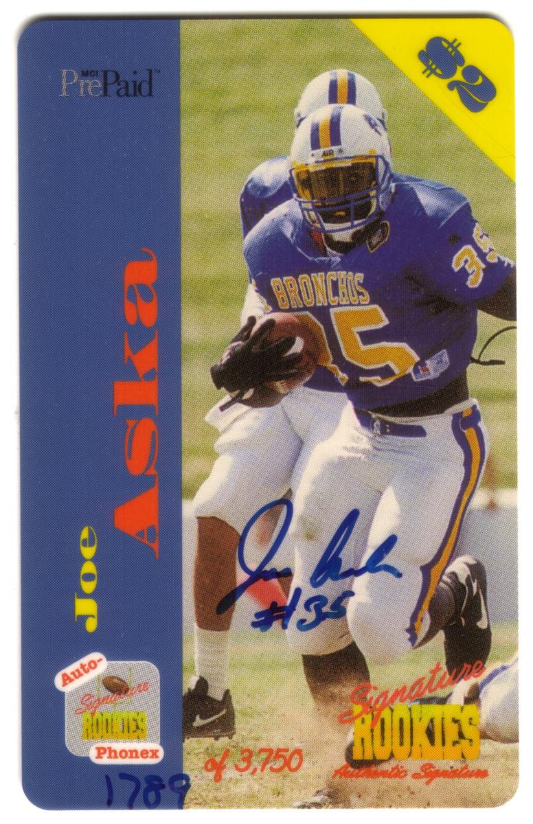 This collectible phone card features Joe Aska, an NFL football player, representing the category Auto-Phonex Signature Rookies. Joe Aska is pictured prominently with his name printed on the card. The card is numbered 35 out of a limited edition series of 40 cards. The front of the card displays the MCI Communications logo, linking it to the telecommunications provider.
