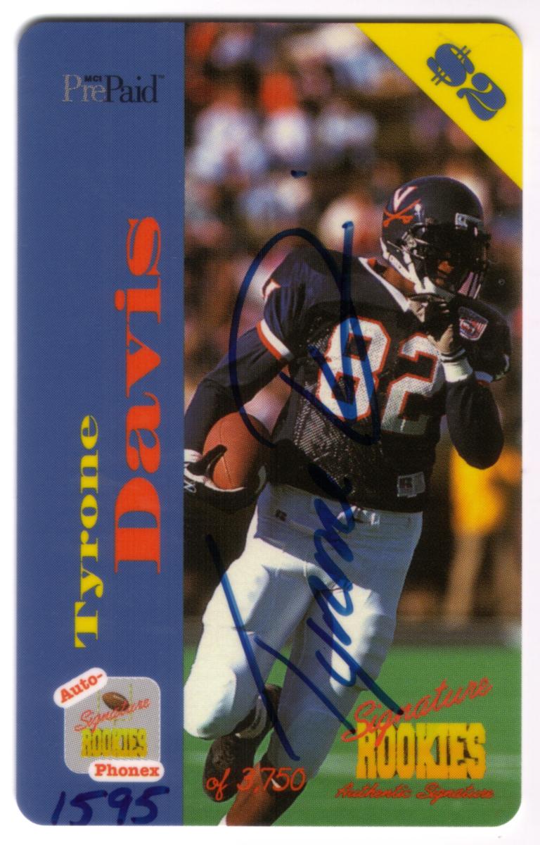 Overall, this collectible phone card celebrates Tyrone Davis as an NFL football player through its clear imagery, branding, and series information, making it a sports memorabilia item linked to MCI Communications and football collectibles.