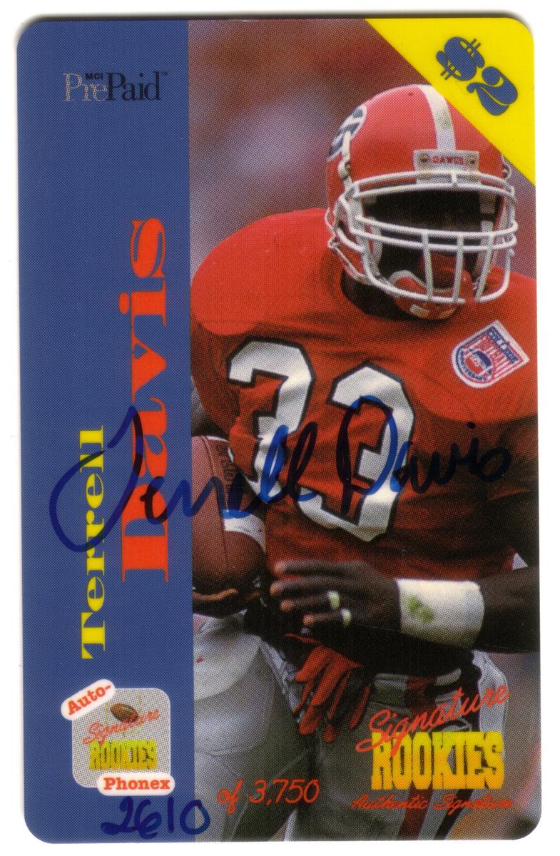 This phone card represents a notable collectible that combines sports memorabilia and telecommunications branding. Its presentation is intended for collectors interested in NFL athletes, especially fans of Terrell Davis, within the series of Auto-Phonex Signature Rookies issued by MCI Communications.