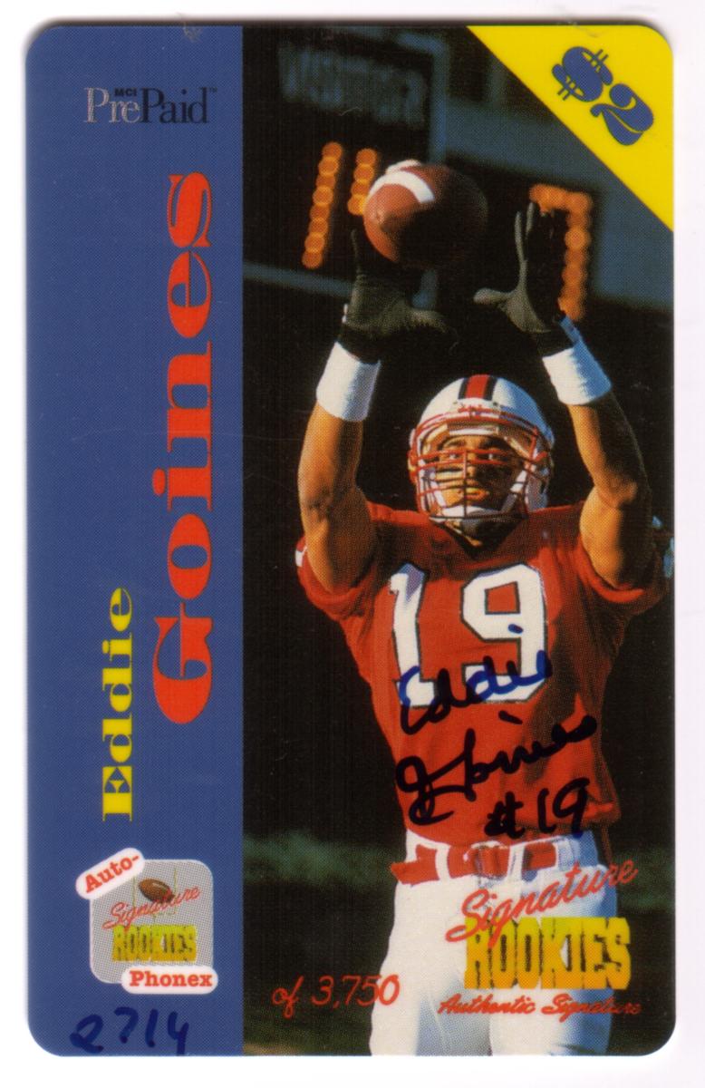 The card includes the logos of the NFL and MCI Communications, linking it to the official football league and a major telecommunications company. It also features branding for Auto-Phonex, indicating a connection to phone card or collectible phone card series. The design incorporates elements related to football and athletics, emphasizing Eddie Goines as an athlete.
