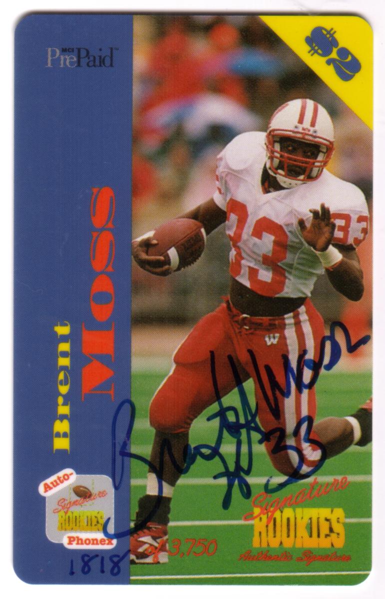 This collectible phone card features Brent Moss, who is identified on the card as part of the Auto-Phonex Signature Rookies series. Brent Moss is a football player associated with the National Football League (NFL), as indicated by the football iconography and text on the card. The card is numbered 22 out of a limited set of 40 cards. The card’s design includes the MCI Communications logo along with branding for WorldCom, highlighting its association with telecommunications.