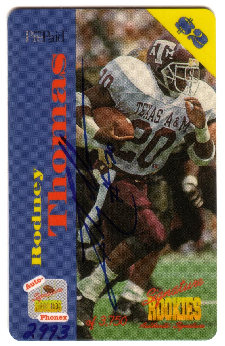 Overall, the card highlights Rodney Thomas’s role as a rookie player recognized by the Auto-Phonex Signature Rookies collection, combining NFL branding and MCI Communications sponsorship to create a specialty football collectible.