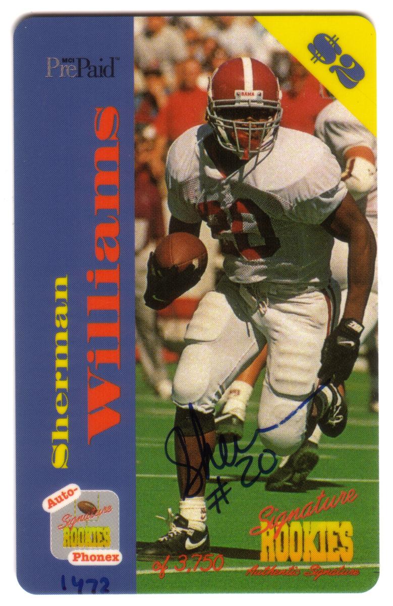 This collectible chip card features Sherman Williams, an American football player, prominently in the foreground. He is dressed in his football uniform, wearing the white jersey of the University of Alabama Crimson Tide, identifiable by the crimson helmet with the distinctive Alabama "A" logo visible near the top right corner. Sherman Williams is shown in a running position, holding the football securely under one arm, suggesting action on the field.