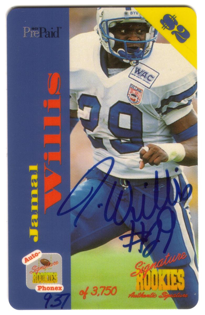 This collectible phone card features Jamal Willis, an NFL football player, as part of the Auto-Phonex Signature Rookies series. The card is numbered 7 out of 40 in the series. Jamal Willis is pictured wearing a football uniform and helmet without a visible jersey number, positioned prominently on the left side of the card. The design incorporates the logo and branding of MCI Communications at the top right corner.