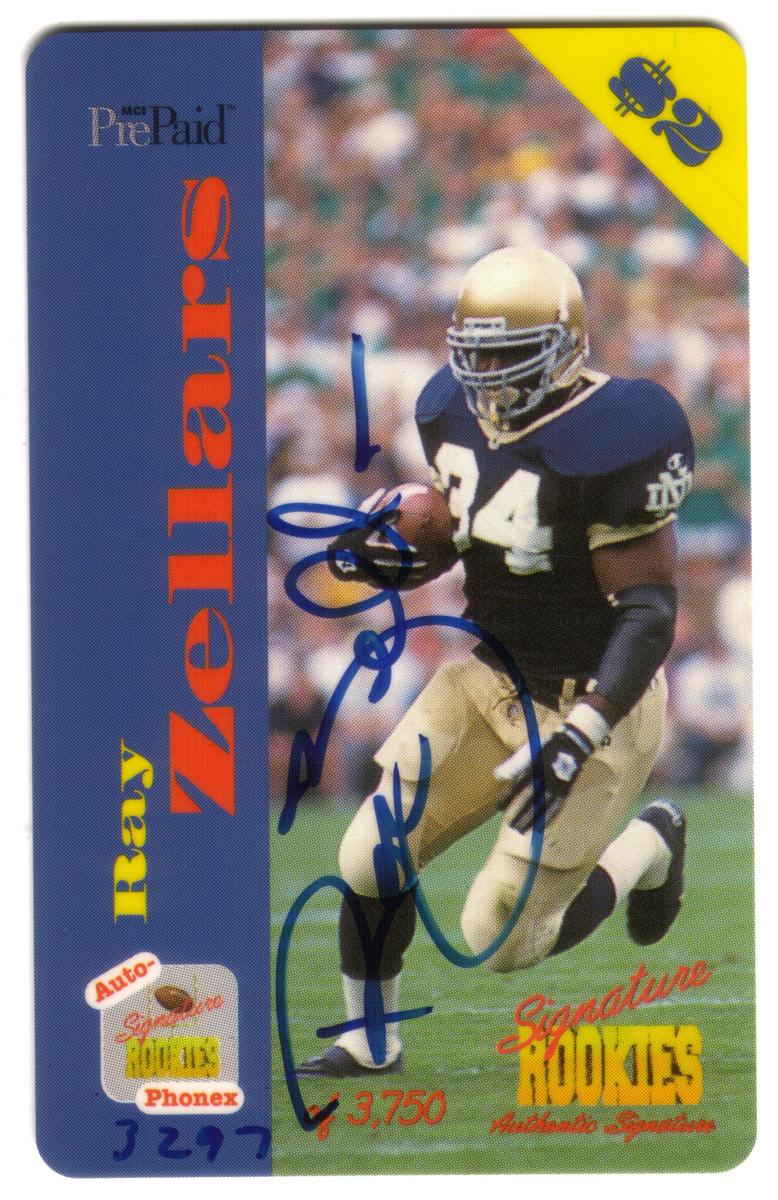 The overall design emphasizes football and the NFL, highlighting Ray Zellars as a rookie athlete. The text "Auto-Phonex" appears clearly, along with "$2," which likely denotes the card’s value or calling credit. The card’s surface contains a mix of photographic imagery and graphic elements, focusing on the theme of professional football.