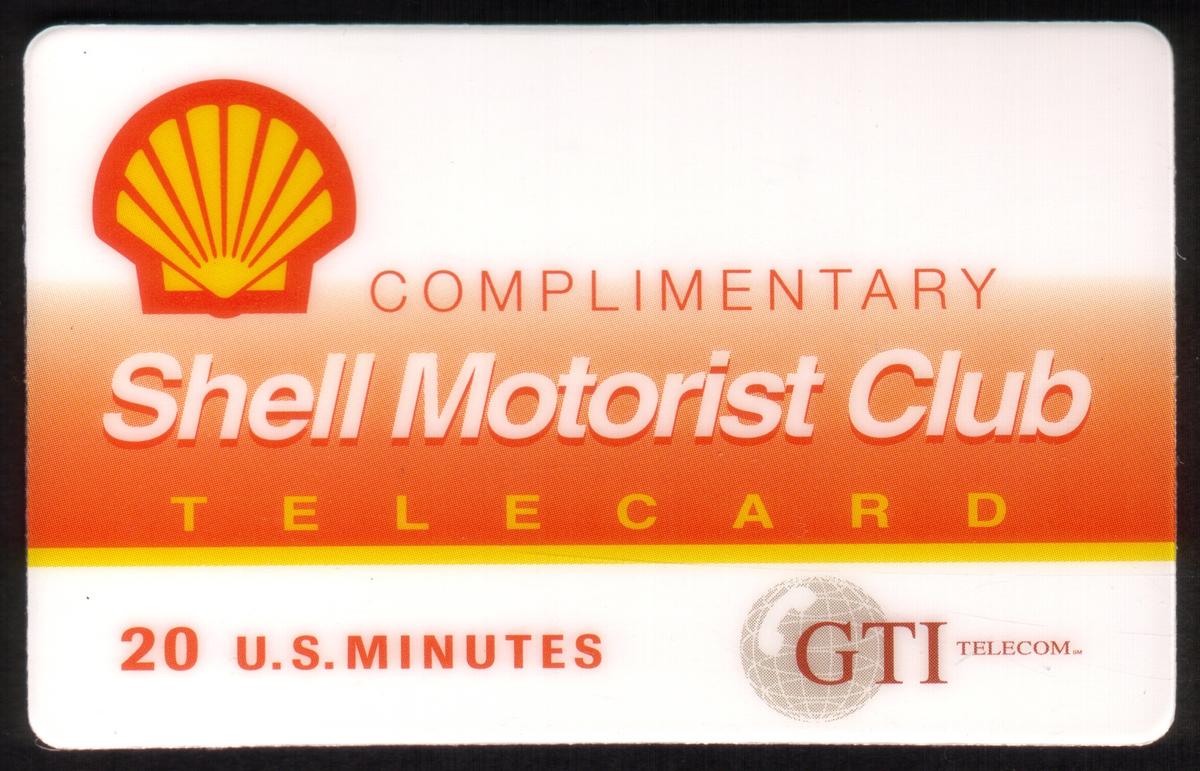 Shell Motorist Club telecard featuring Shell logo, vibrant colors, 20 U.S. minutes, and telecom branding, blending automotive loyalty with communication utility. |