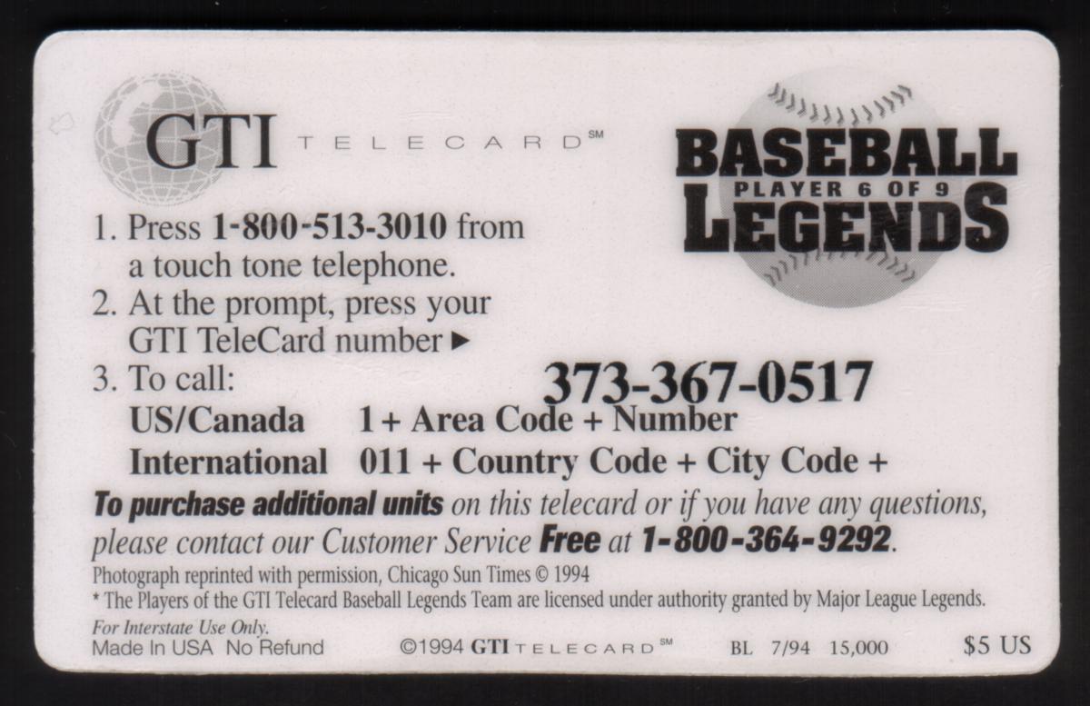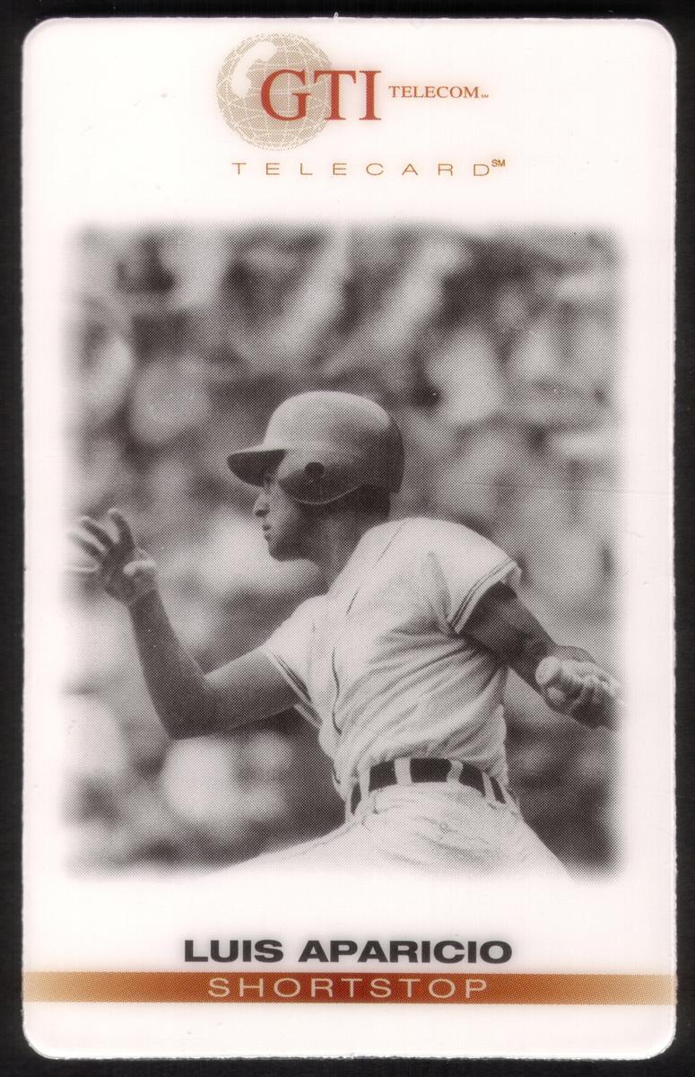 This card references Major League Baseball (MLB) and highlights Luis Aparicio's legacy as a baseball legend with ties to Venezuela and MLB cities including Chicago, Baltimore, and Boston. The card is a collectible item celebrating his career in baseball, issued by GTI Telecom, Inc.