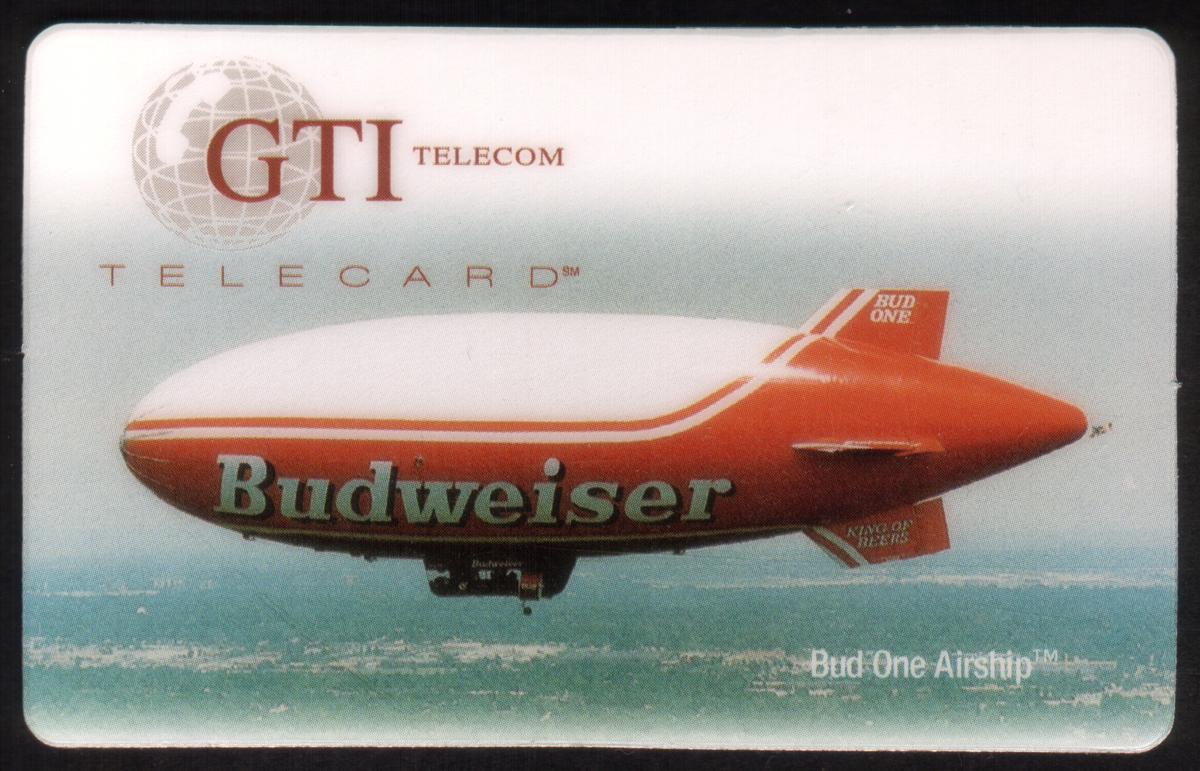 The card is issued by GTI Telecom, Inc., as noted in the design, which places this item within their production. The word “SPECIMEN” is printed on the card, marking it as a sample or special edition rather than a standard issue. The prominent branding makes it clear that the blimp serves as a flying billboard for Budweiser, as it is closely tied to the company’s marketing efforts.