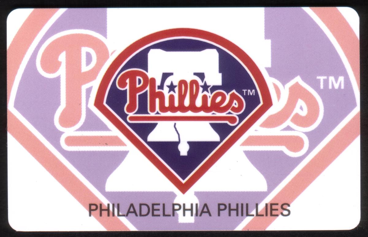 This collectible phone card features the logo of the Philadelphia Phillies, a Major League Baseball (MLB) team. The logo is prominently placed in the center of the card and includes the classic Phillies script inside a red baseball-style shape with a white background. Above the logo, the text "Major League Baseball Team Logo" is visible, and below it, there is the “MLB” emblem in full color.