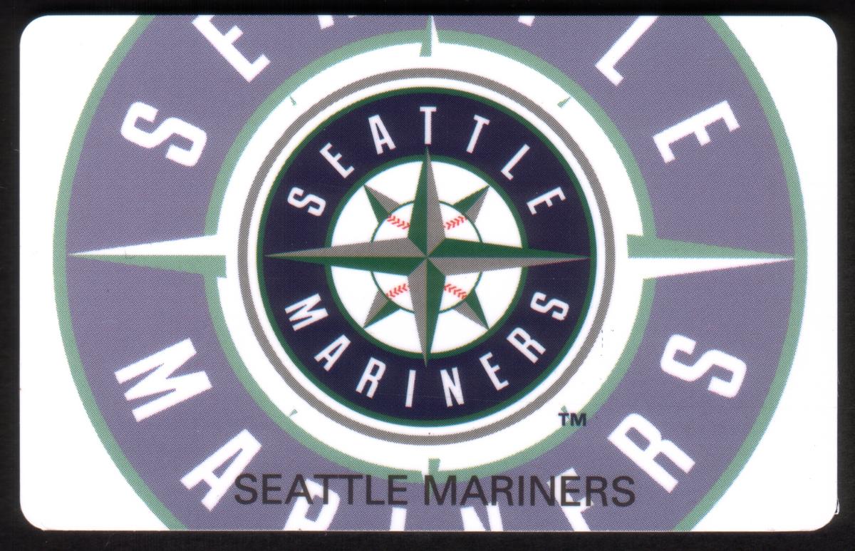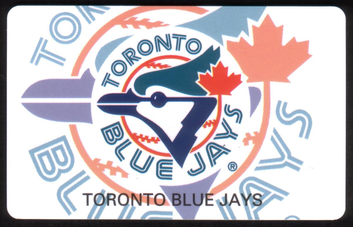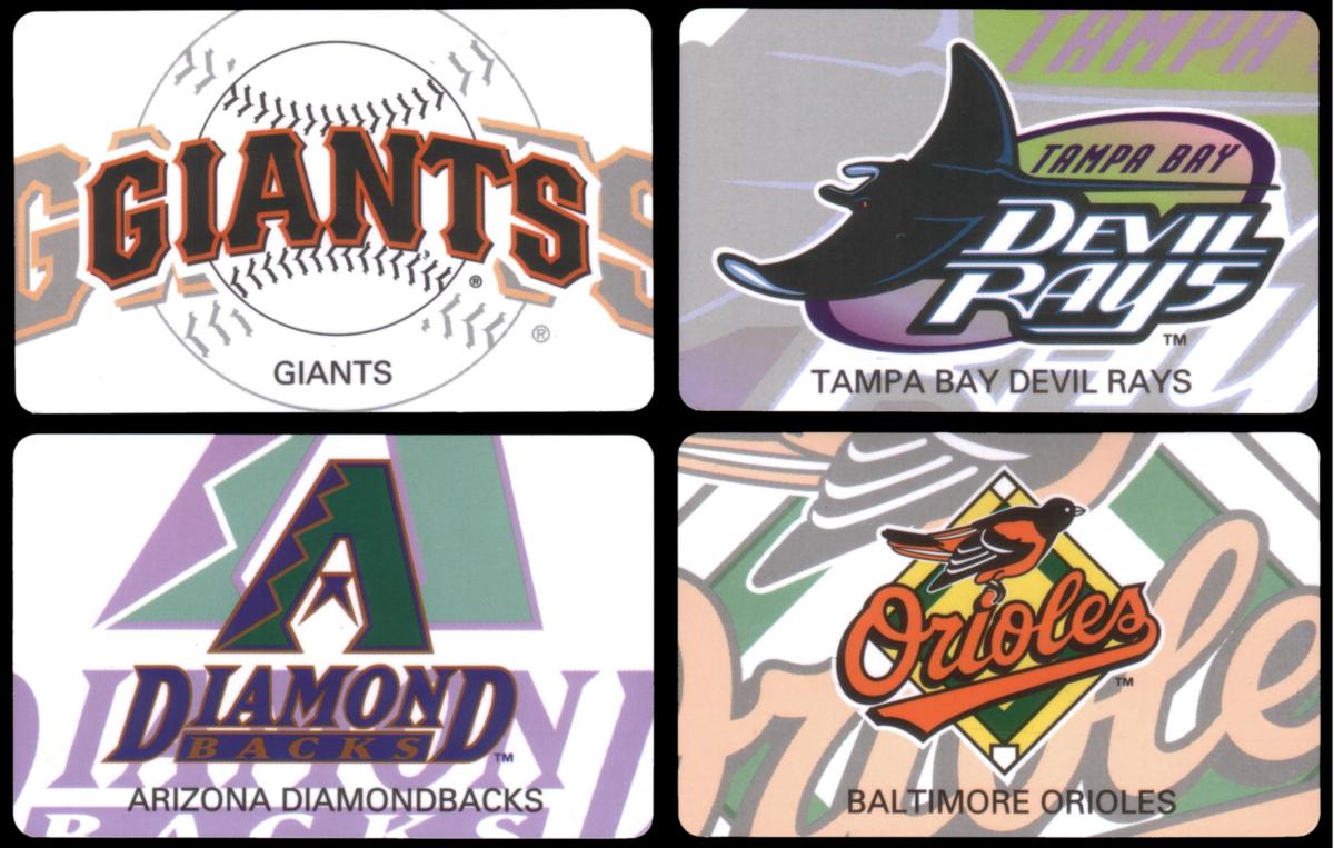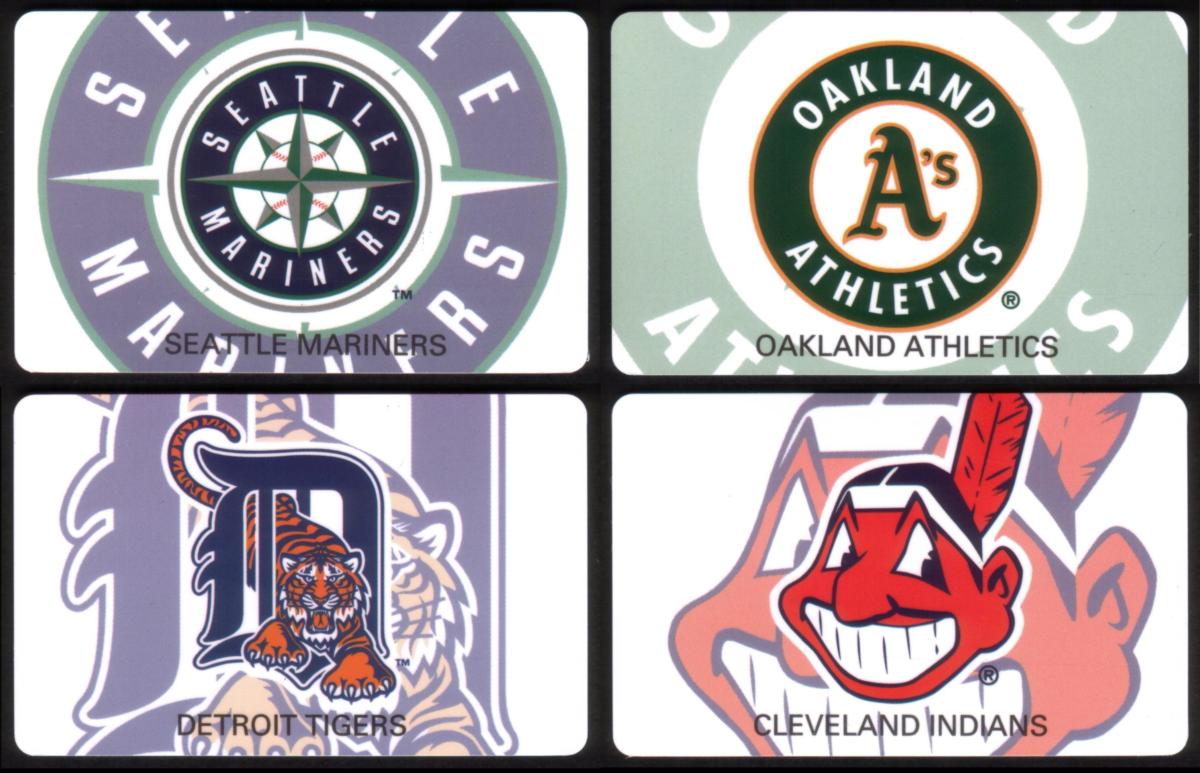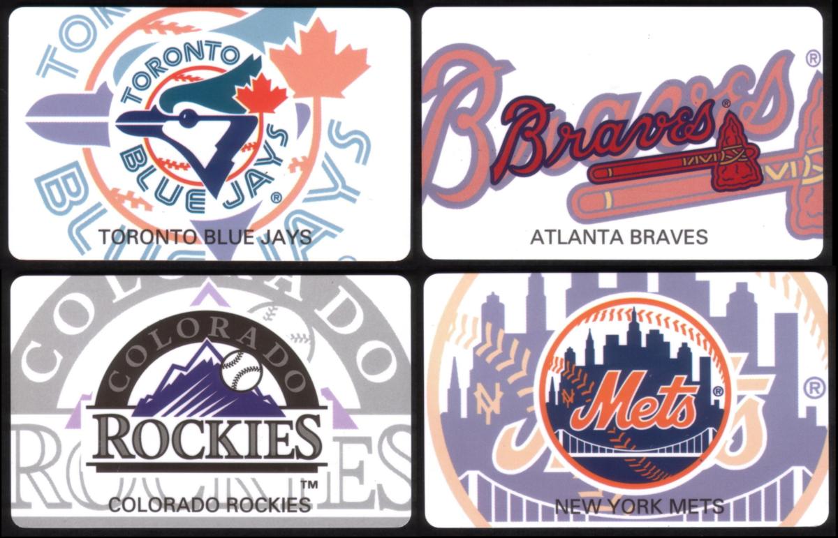 The artwork on the cards features each team’s official logo in bright, vivid colors. For example, the Montreal Expos card highlights the classic red, white, and blue "M" fittingly shaped to represent an "E" and "b," while the Arizona Diamondbacks card showcases the stylized "A" with a snake design integrated into the letter. The Atlanta Braves’ card illustrates the script “Braves” with the iconic tomahawk beneath it. Noteworthy logos include the Boston Red Sox’s red socks crossed in a circular shape, the Cleveland Indians’ smiling Chief Wahoo character, and the Seattle Mariners’ compass rose surrounding a baseball.