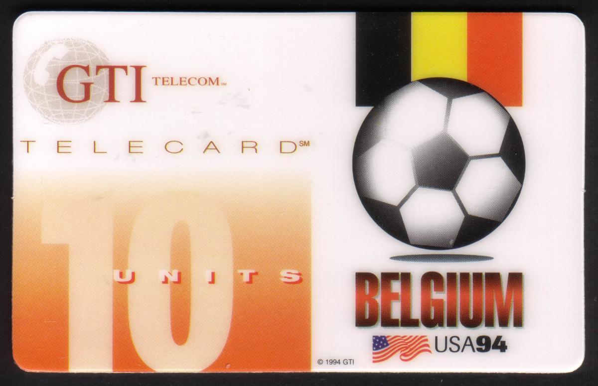 This collectible phone card features the official logo of the 1994 FIFA World Cup, which is the tenth edition of the tournament. The card prominently displays the name "Belgium" in large white letters against a red background, indicating the featured national team. The background consists of several soccer balls and international flags, symbolizing the global nature of the event. The words “10u World Cup Soccer (1994)” are printed near the bottom, specifying the card’s theme and year.