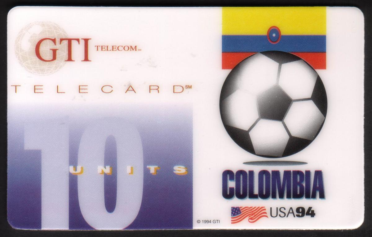 This collectible phone card commemorates the 1994 FIFA World Cup, featuring Colombia. The card prominently displays the national flag of Colombia on the left side. To the right, there are three international flags: the Brazilian flag, the Italian flag, and the United States flag, arranged vertically. The background of the card is blue with a pattern that resembles netting, reinforcing the soccer theme.