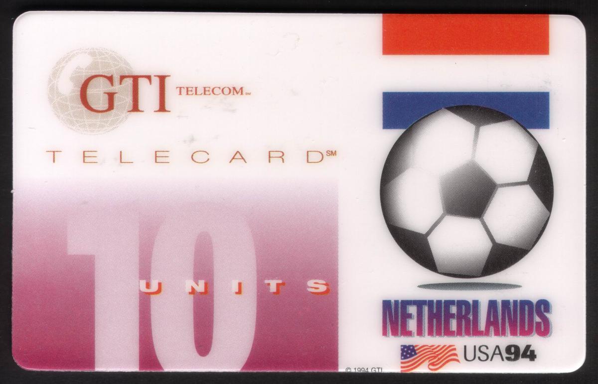 This phone card is a collectible item linked directly to the 1994 FIFA World Cup and the Dutch national soccer team’s participation. The inclusion of international flags, the official World Cup logo, and the GTI Telecom, Inc. branding firmly situates this card within the realm of soccer memorabilia tied to a major international sporting event.