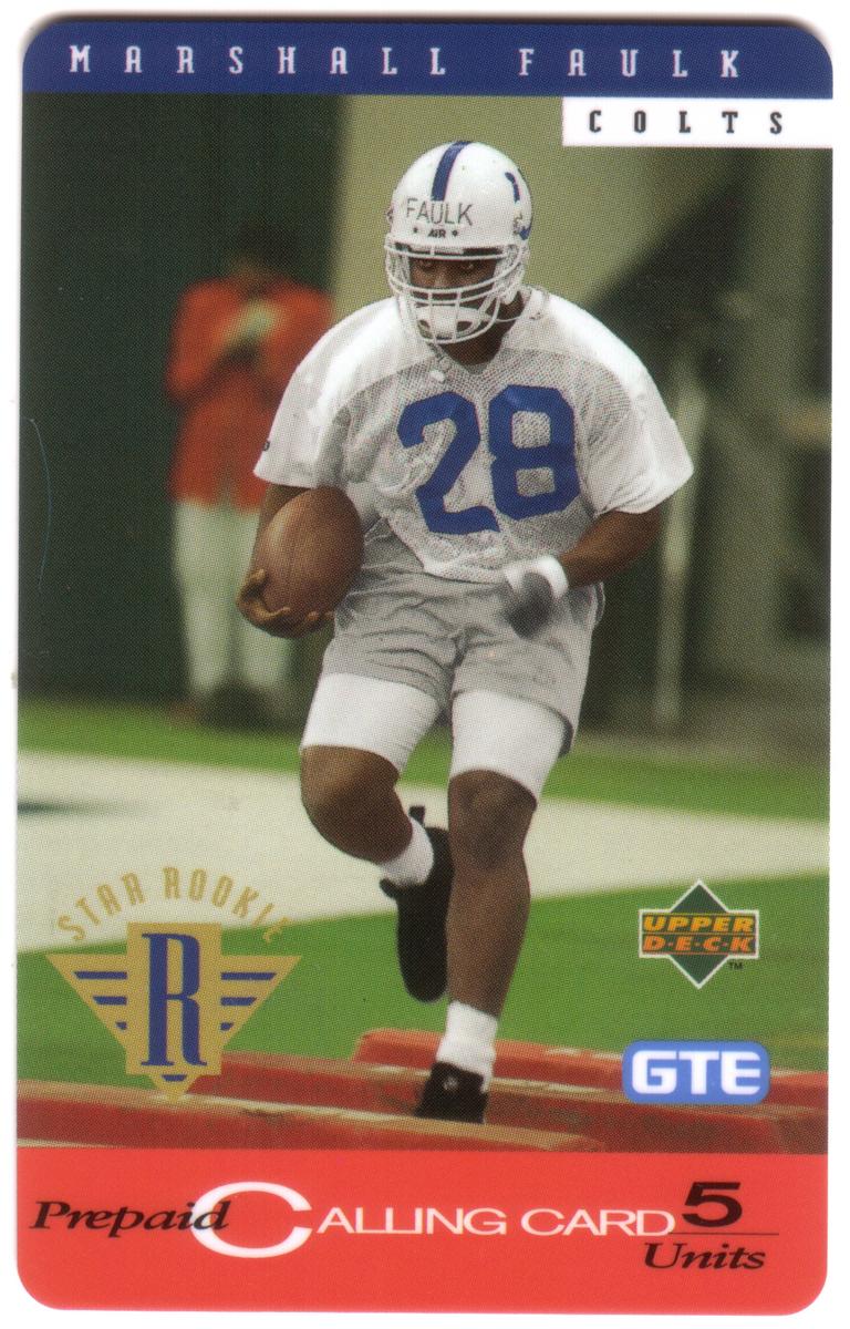 The design includes the Upper Deck logo, indicating the card’s manufacturer, and the inscription “Star Rookie 5U GTE,” marking this card as part of a special edition series focused on promising rookie players. The card highlights the football theme clearly through its vibrant imagery and branding centered on the sport. The combination of visual elements and text focuses attention on Marshall Faulk’s early career with the Colts.