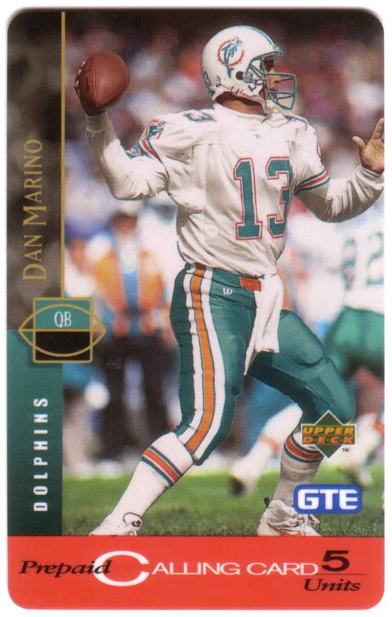 Text on the card includes clear identifiers such as “Dan Marino,” “Dolphins,” and mentions the NFL, confirming its football-related content. The color scheme prominently features green and orange accents, complementing the Dolphins’ team colors and emphasizing the football theme. This card is a collectible item honoring Dan Marino’s legacy within professional American football.