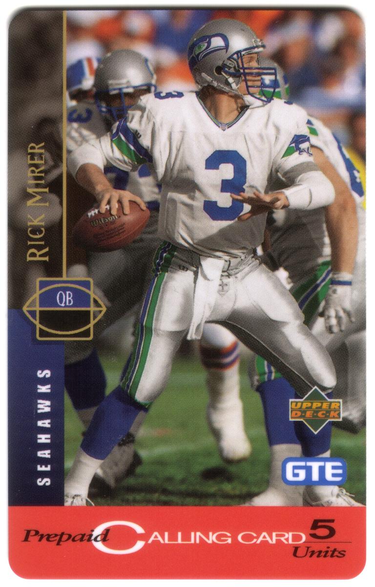 Additionally, the card includes text identifying Rick Mirer and the Seahawks, along with the NFL logo, situating the card firmly within professional American football collectibles. The card uses clean and bold typography to detail the player’s name and team affiliation, creating an attractive and collectible sports memorabilia item.