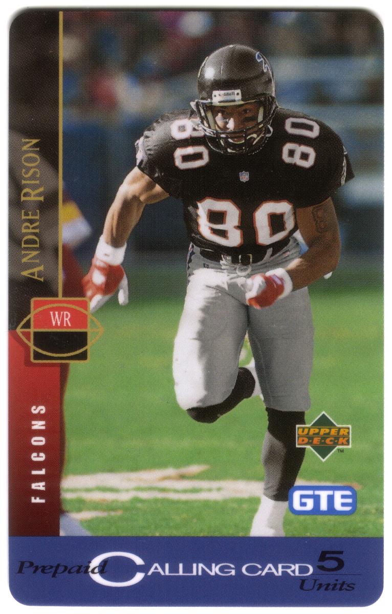 Additional markings on the card indicate it was produced in collaboration with Sprint, a telecommunications company, and the card’s style aligns with merchandise produced by GTE. There are no other player names or team logos visible aside from those pertaining to Andre Rison and the Atlanta Falcons. The card is a collectible item celebrating Rison’s NFL career during his time with the Falcons.
