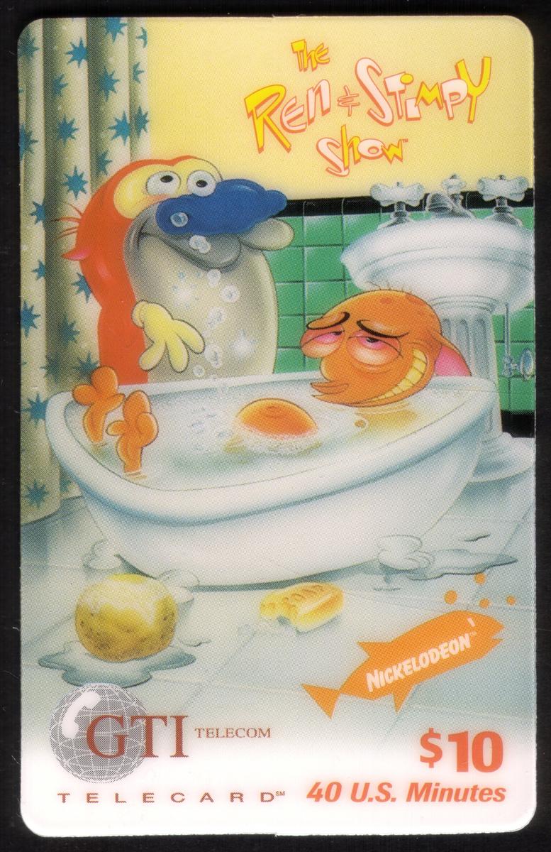 Along the bottom edge of the card, the text reads "Ren & Stimpy Taking A Bubble Bath (Nickelodeon Cartoon Show)" along with the name GTI Telecom, Inc., which indicates the card issuer. This phone card is a collectible item emphasizing both the artistic and nostalgic elements of the Ren & Stimpy animated series.