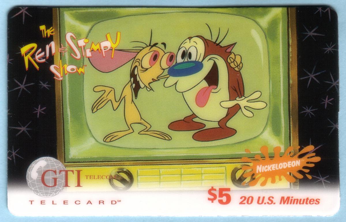 The card is issued by GTI Telecom, Inc., and has a denomination of $5, which is printed on the card. The artwork reflects the show's unique and distinctive animation style, capturing the essence of the 1990s animated series. The title “Ren & Stimpy Cartoon Show On Television (Nickelodeon TV)” is prominently displayed on the card, linking it to the popular television program.