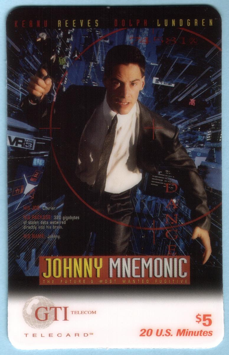 This collectible phone card features a promotional image from the movie *Johnny Mnemonic*, starring Keanu Reeves and Dolph Lundgren. The card prominently displays Keanu Reeves as Johnny Mnemonic, holding a gun with his arm extended upward. The scene presents a futuristic and wired aesthetic, consistent with the film’s cyberpunk theme. The characters and styling reflect Hollywood’s vision of a high-tech future, emphasizing the movie’s focus on technology and espionage.