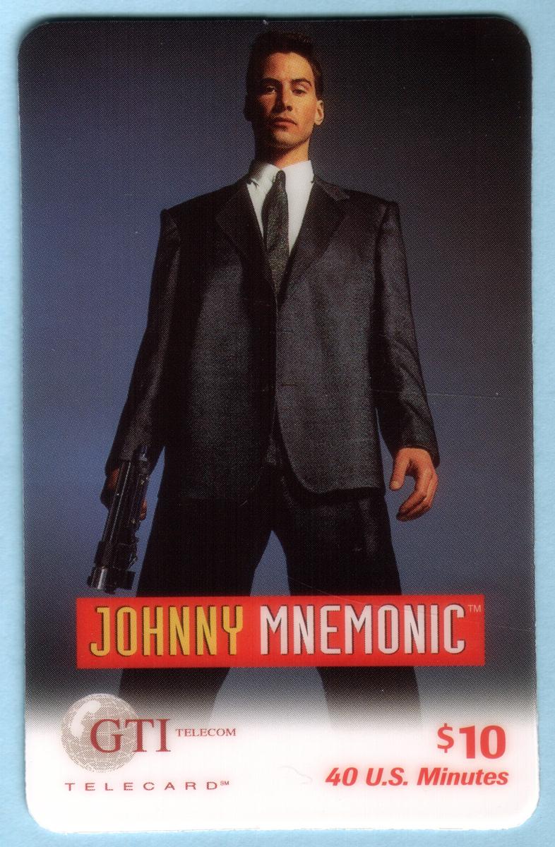 $10 Johnny Mnemonic phone card featuring Keanu Reeves in a cyberpunk design, with film branding, GTI Telecom logo, 40 U.S. minutes, and vintage futuristic aesthetics. |