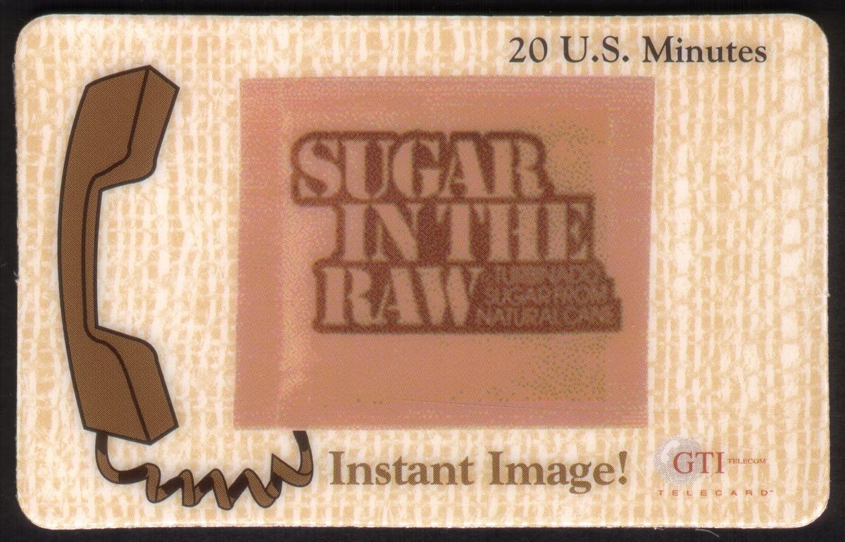 This collectible phone card features the brand "20m Sugar In The Raw" prominently displayed across the front. The text "Instant Image" and "Sugar From Natural Cane" appear on the card, indicating the product being promoted is a natural cane sugar product. The phone card is issued by GTI Telecom, Inc., whose logo and name are clearly printed on the card.
