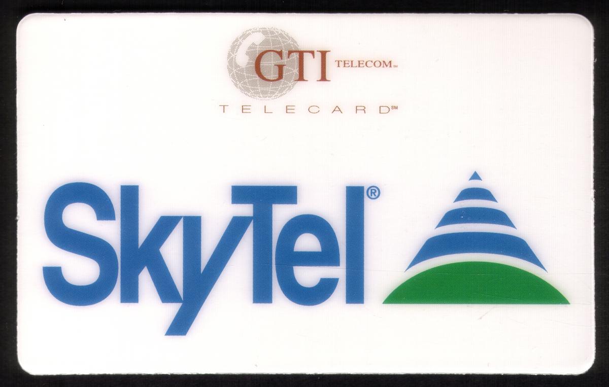 This collectible corporate phone card features the SkyTel logo prominently displayed in white and blue in the lower-left corner. The card is issued by GTI Telecom, Inc. and includes the Portuguese language designation in the top left area, indicating its regional use. The card’s dominant backdrop is a deep blue gradient with a subtle, modern circuitry pattern overlay, symbolizing telecommunications technology.