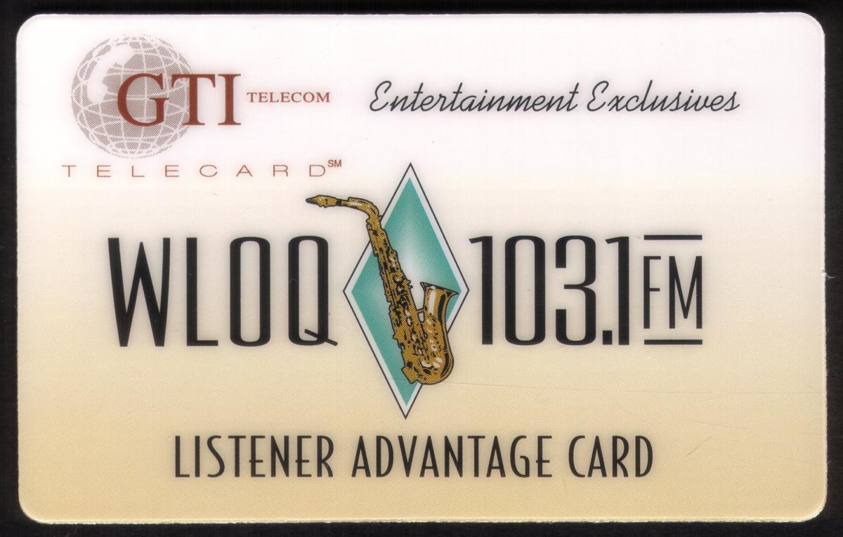 This card functions as a collectible phone card, with no mention or indication of it being a bank card or other type of payment card. It clearly highlights the listener advantage program connected to WLOQ Radio (103.1 FM) and features musical imagery through the saxophone graphic and music-related text.