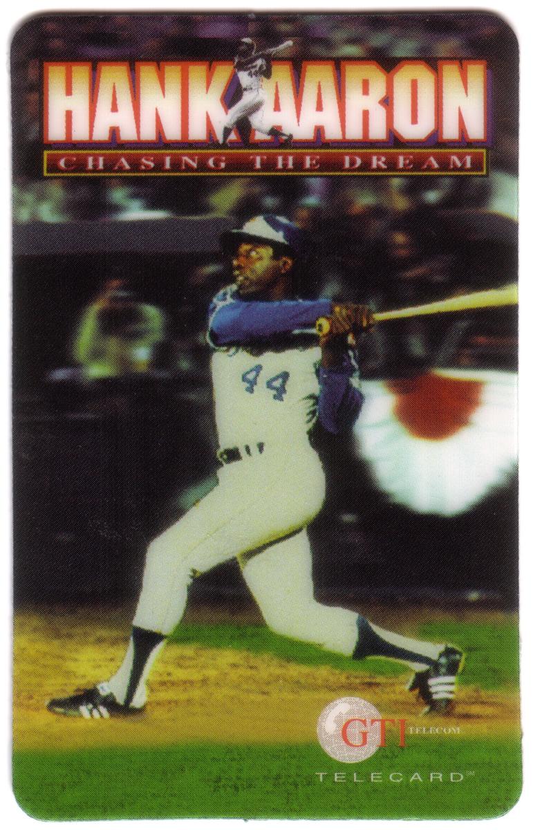 This collectible baseball card features an image of Hank Aaron, one of Major League Baseball's all-time legends. The card showcases Hank Aaron in a batting stance, emphasizing his iconic role as a powerful hitter. The phrase "Batting Chasing The Dream Baseball" appears on the card, highlighting the theme centered on his pursuit of baseball greatness. The card is issued by GTI Telecom, Inc., a company known for producing collectible cards related to sports and telecommunications.