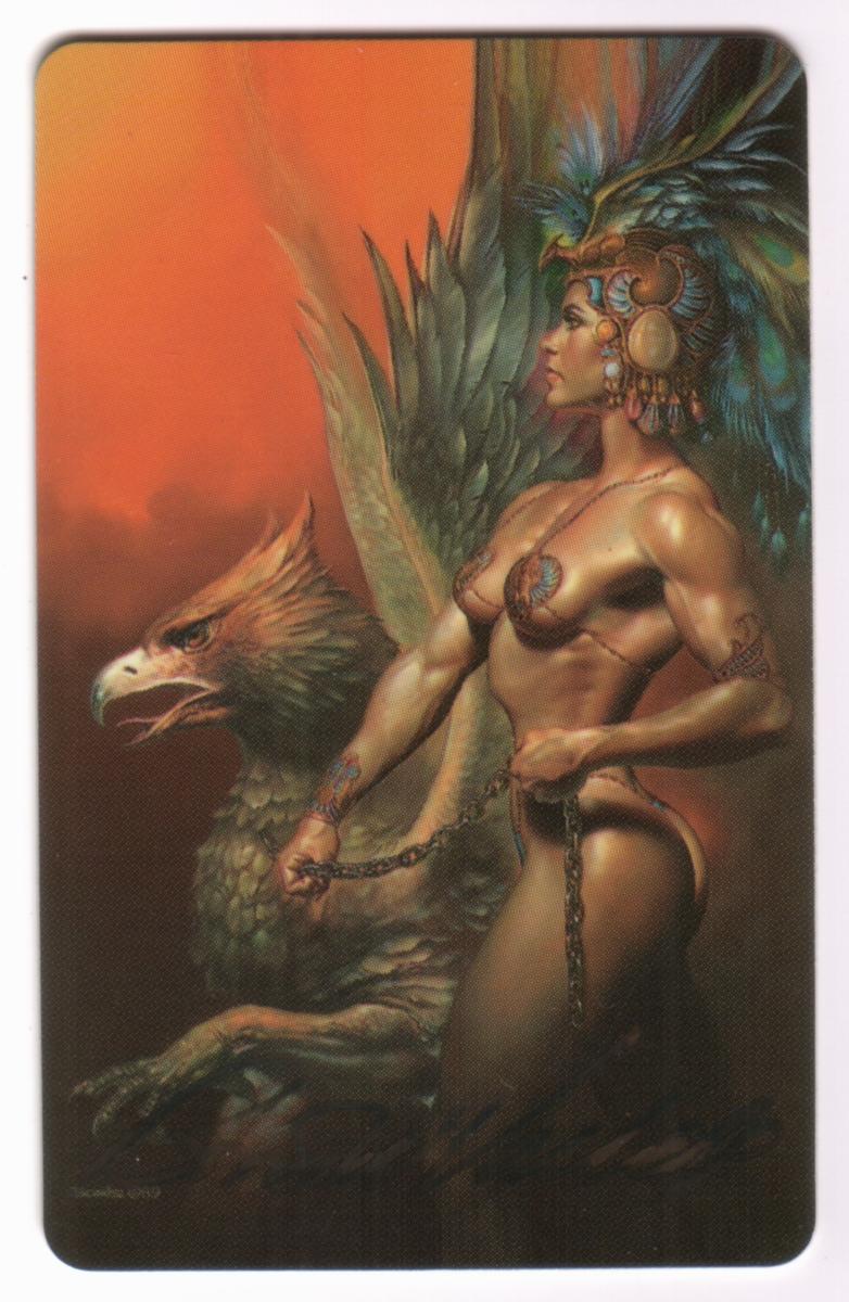 The card’s design emphasizes the powerful connection between the woman and the gryphon, captured in a proud and commanding pose. The gryphon itself is shown with sharp, expressive features, conveying strength and vigilance. This piece represents both artistic fantasy and elements of mythical storytelling, characteristic of Boris Vallejo’s work.
