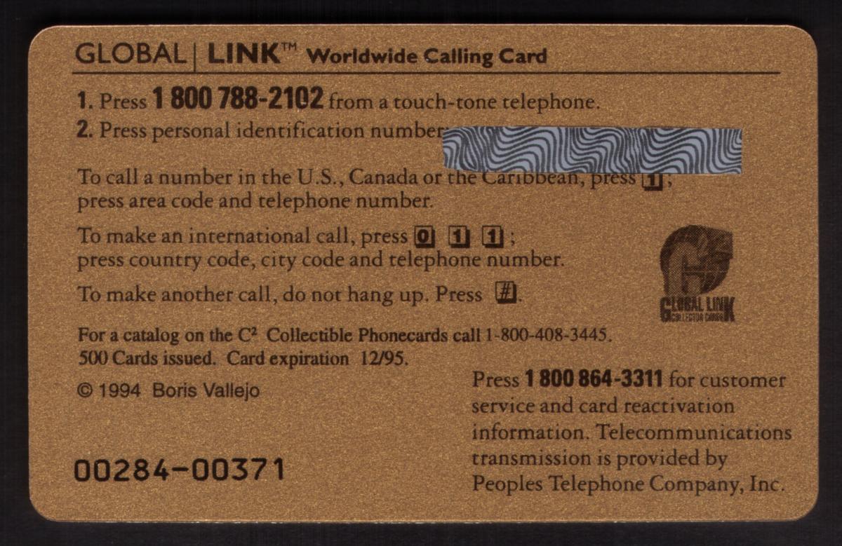 This phone card includes a gold back and is officially signed by Boris Vallejo, confirming its authenticity and collectible value. It was issued by Peoples Telephone Co. and is marked with SKU-19336. The combination of original autograph, detailed fantasy artwork, and high-quality production makes this phone card a prized item for collectors of fantasy art and telephone memorabilia.