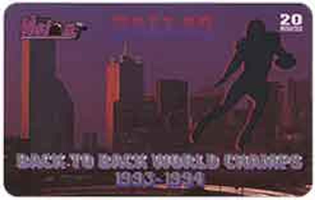 This collectible phone card features a vibrant image celebrating the Dallas Cowboys football team, highlighting their achievement as "Back To Back World Champs 1993-1994." The card prominently displays the Dallas, Texas skyline at sunset or twilight, with the city buildings illuminated against a deep blue sky. Across the lower portion of the card, the text "Back To Back World Champs 1993-1994" is boldly printed in white with a black shadow effect, emphasizing the team's consecutive championship victories during those years.