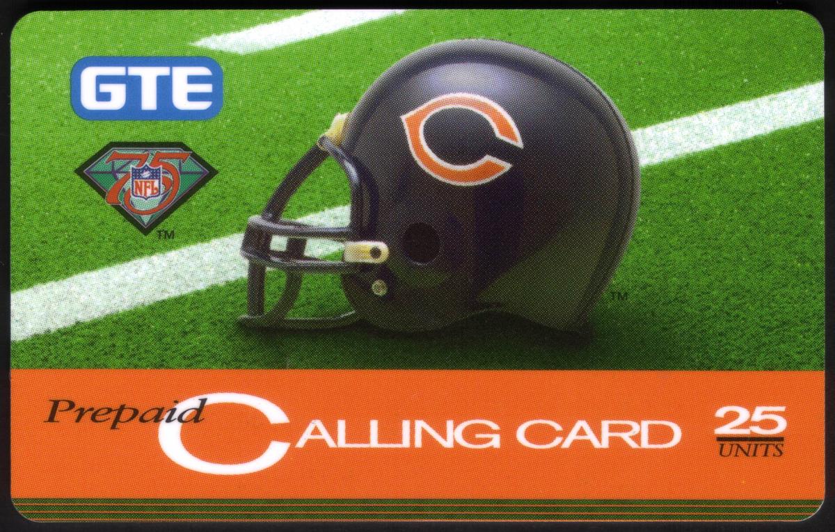 At the top left corner, the text "NFL 75th Anniversary" is shown inside a blue banner, highlighting the significance of the NFL’s milestone anniversary. Below the helmet on the right side, there is the GTE Communications logo, indicating the company associated with this collectible. At the bottom of the card, the phrase "75th Anniversary Football Helmet Series" appears along with the name "Chicago Bears Helmet," clearly identifying the series and the featured NFL team.