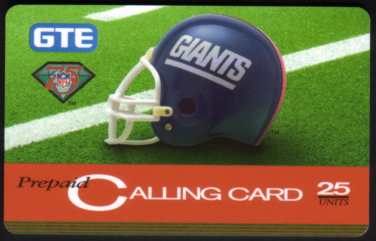 The card includes the official NFL shield logo along with the words "75th Anniversary 25u NFL 75th Anniv Football Helmet Series." The GTE Communications logo is also visible in the lower right corner. The overall design highlights the theme of NFL football, focusing on the helmets worn by teams in the league.