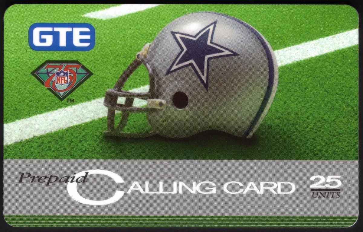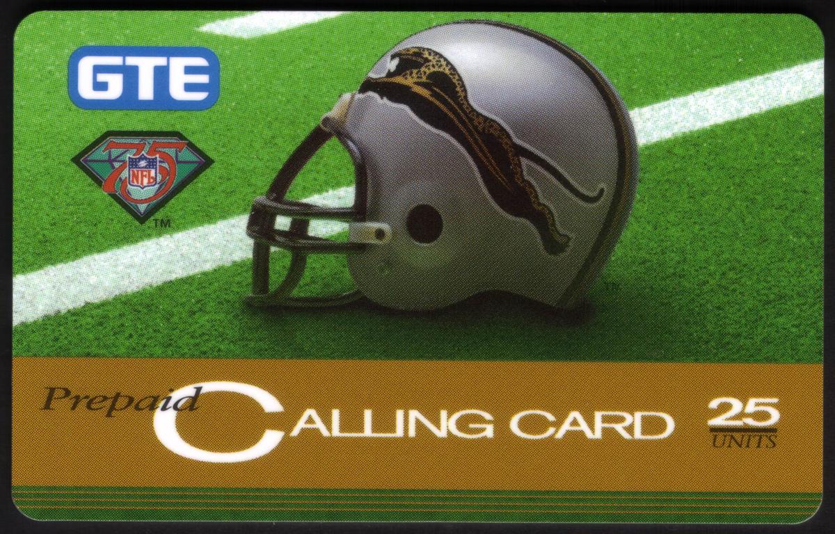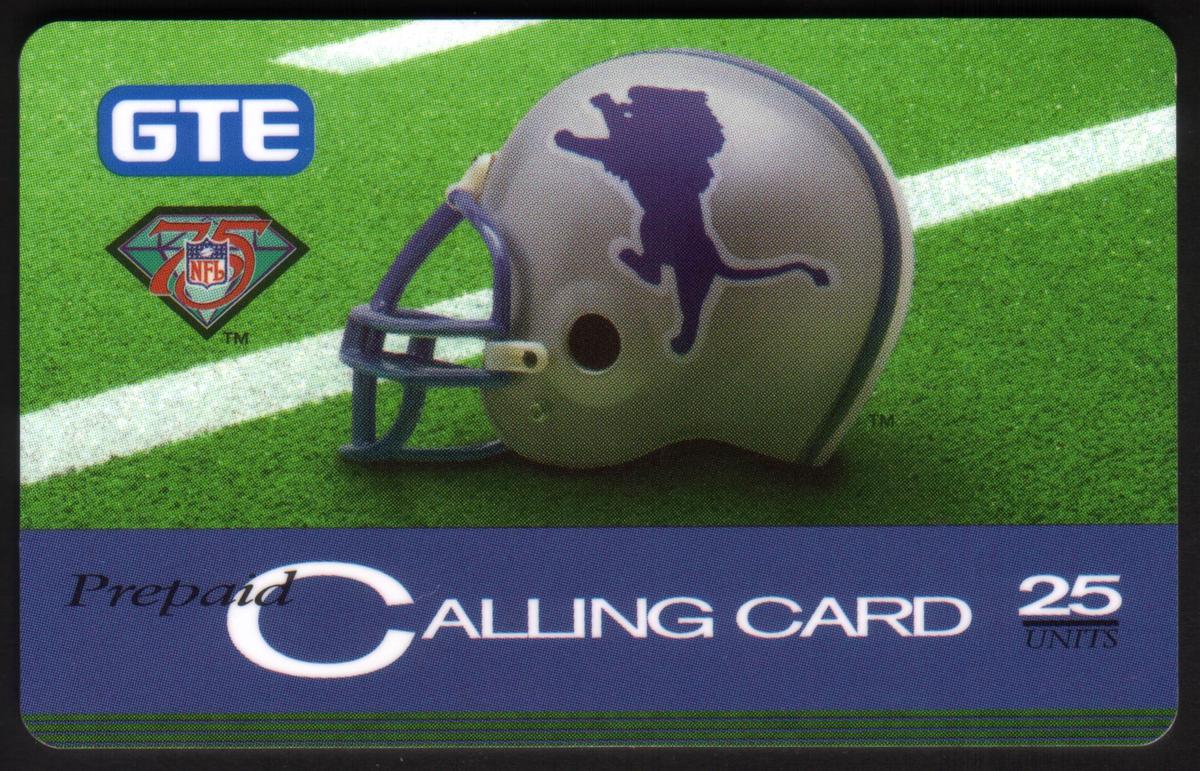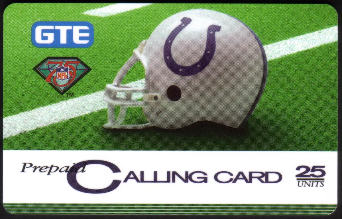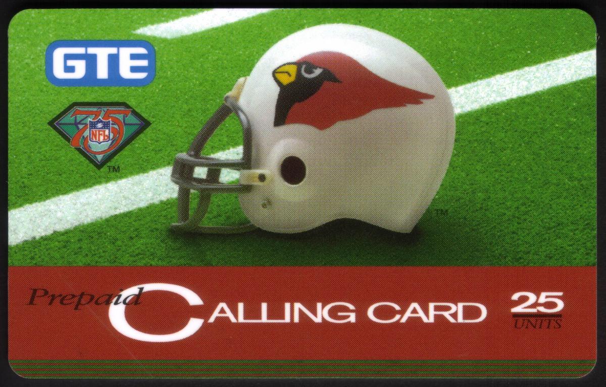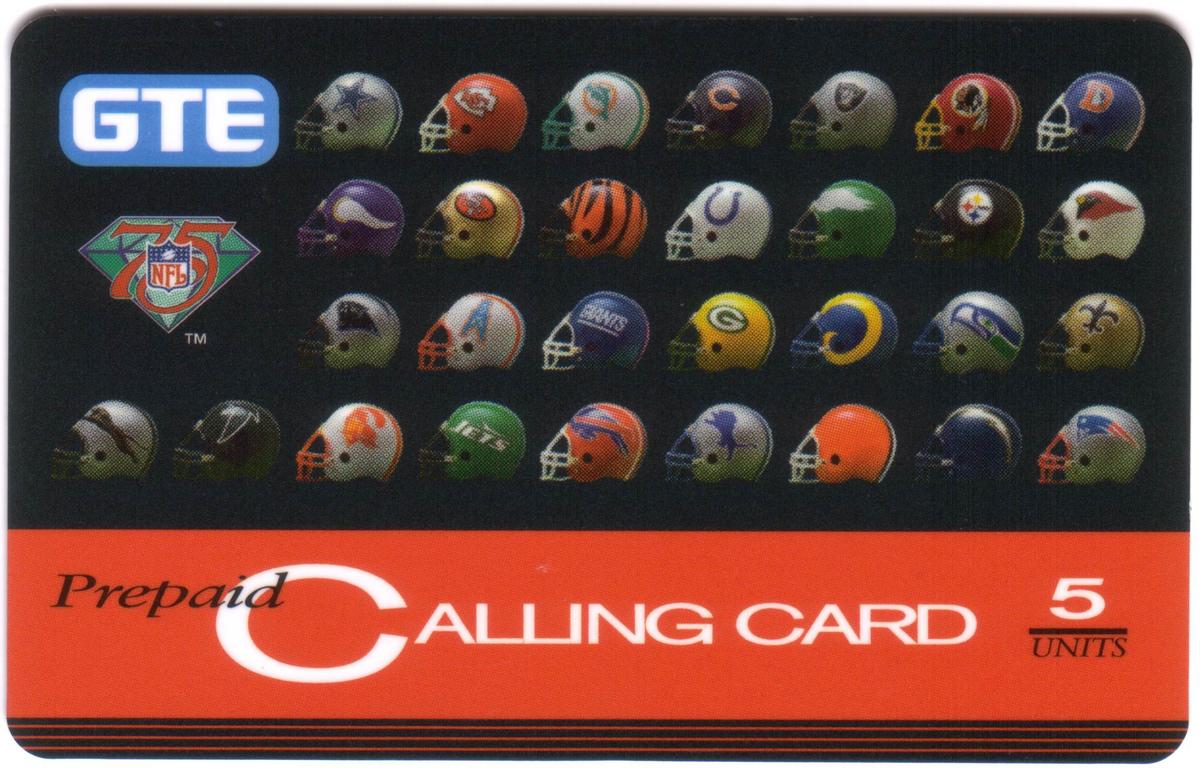 This set of collectible prepaid calling cards from GTE commemorates the 75th anniversary of the National Football League (NFL). Each card prominently features a detailed photographic image of a classic NFL football helmet, shown on a green football field background marked with white yard lines. The helmets represent various NFL teams and are depicted in full color, highlighting their distinctive team logos and designs. The NFL 75th Anniversary emblem and GTE logo appear on each card, reinforcing the official nature of this series.