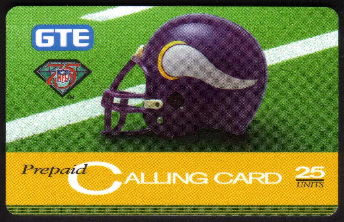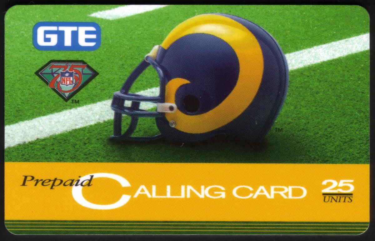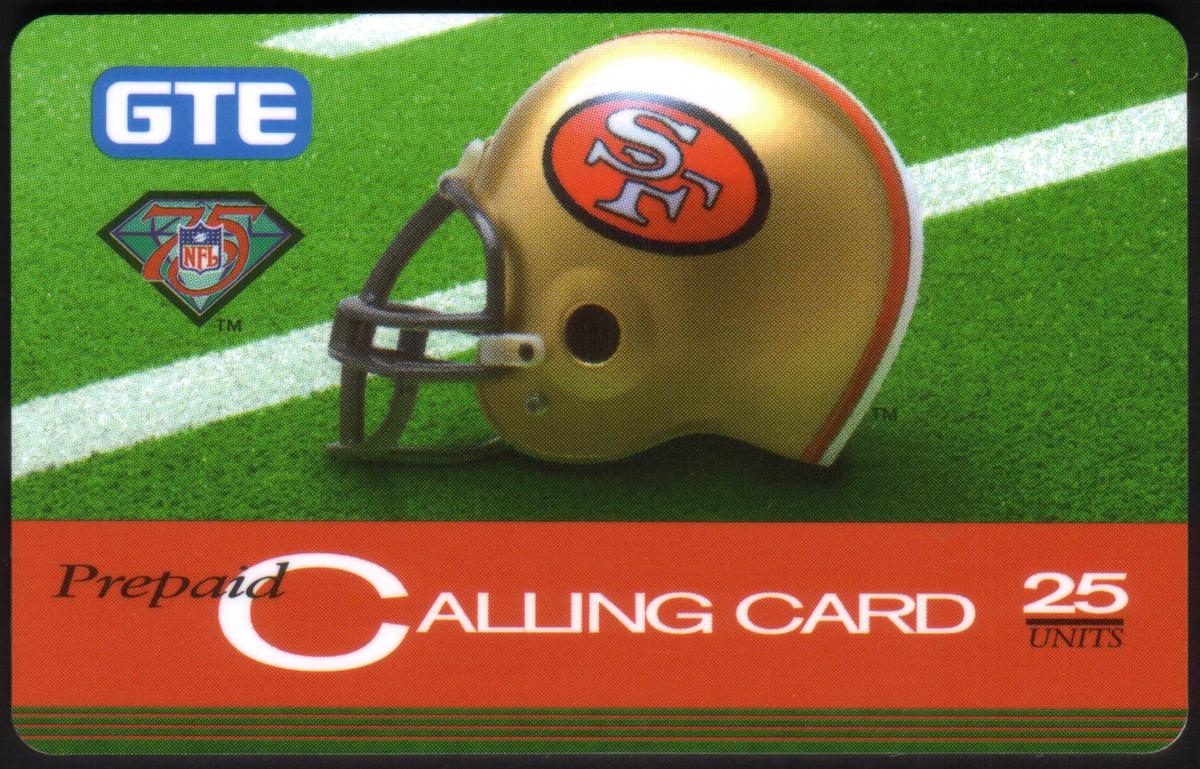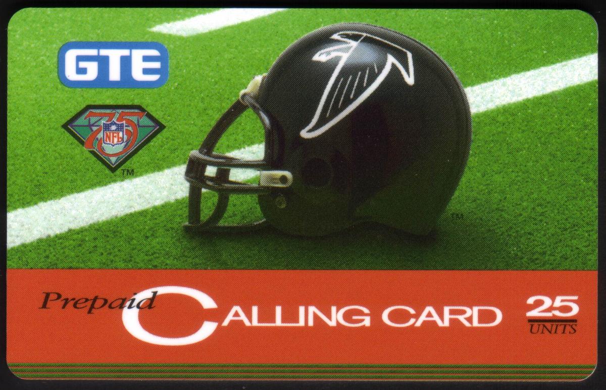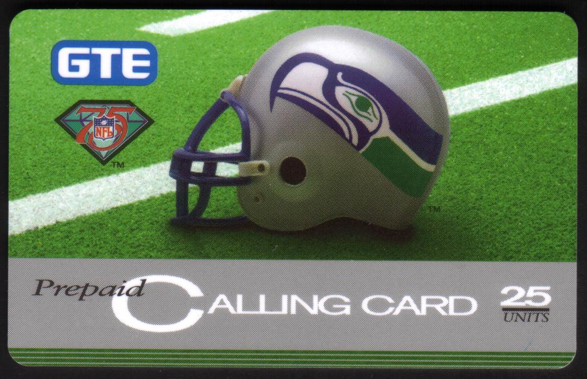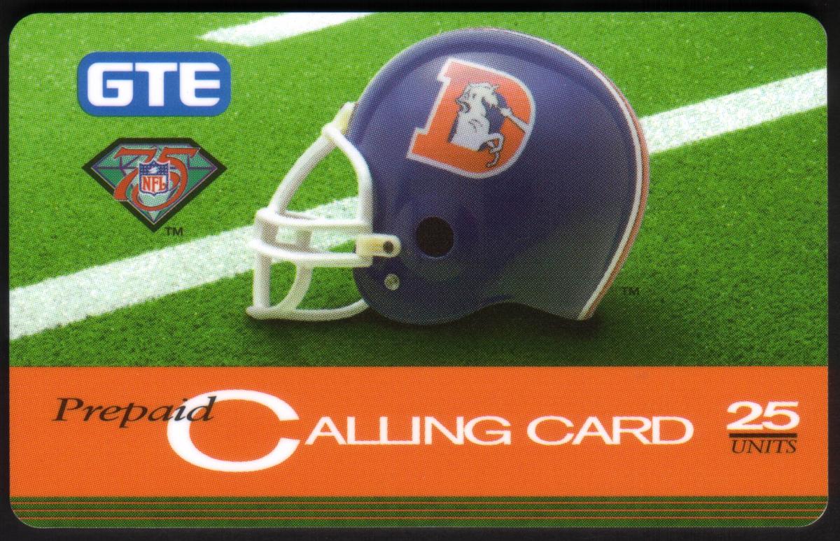 This set of collectible prepaid calling cards from GTE commemorates the 75th anniversary of the National Football League (NFL). Each card prominently features a detailed photographic image of a classic NFL football helmet, shown on a green football field background marked with white yard lines. The helmets represent various NFL teams and are depicted in full color, highlighting their distinctive team logos and designs. The NFL 75th Anniversary emblem and GTE logo appear on each card, reinforcing the official nature of this series.