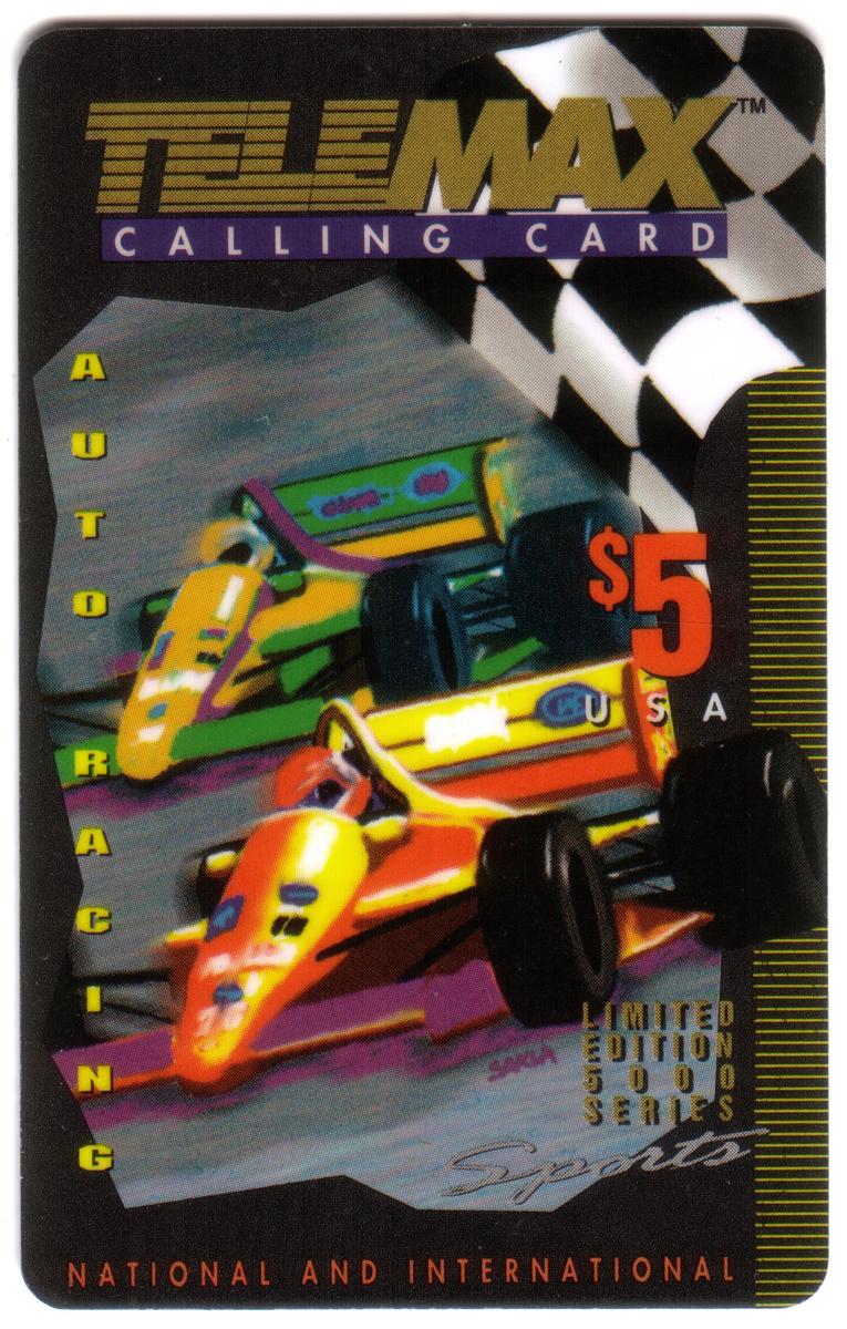 Above the car, the text “$5” is clearly displayed, indicating the card’s value. Along the right side of the card, the words “Generic Sports Series” appear, followed by “Auto Racing,” identifying the specific sports category represented. The bottom right corner includes the logo and name “Telemax Communications,” which denotes the issuing or promotional entity associated with the card.