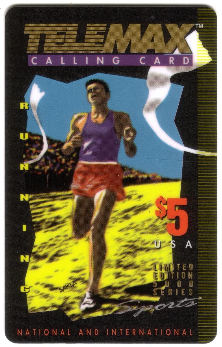 The phone card belongs to the Generic Sports Series focused on running, issued by Telemax Communications. The text "WorldCom" is positioned near the upper right corner of the card, identifying the company associated with this collectible. The value displayed on the card is $5. The overall design uses a blend of bold colors that bring energy and excitement to the imagery, effectively capturing the spirit of competitive running.