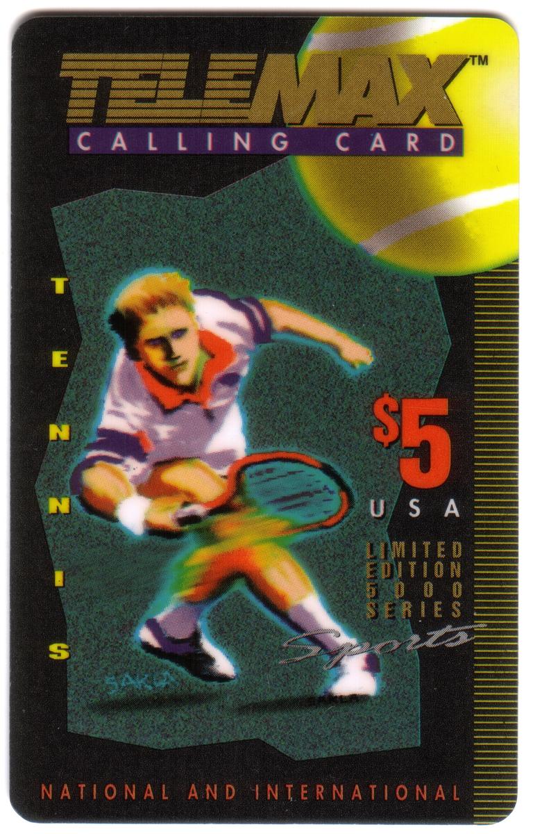 The card has a face value of $5, clearly printed on the front. The branding on the card identifies it as part of a generic sports series focused on tennis, under the issuing entity Telemax Communications. The name "Telemax Communications" appears on the card, confirming the issuing company. The overall color scheme incorporates light tones, reflecting a bright and sunny day during the tennis event.