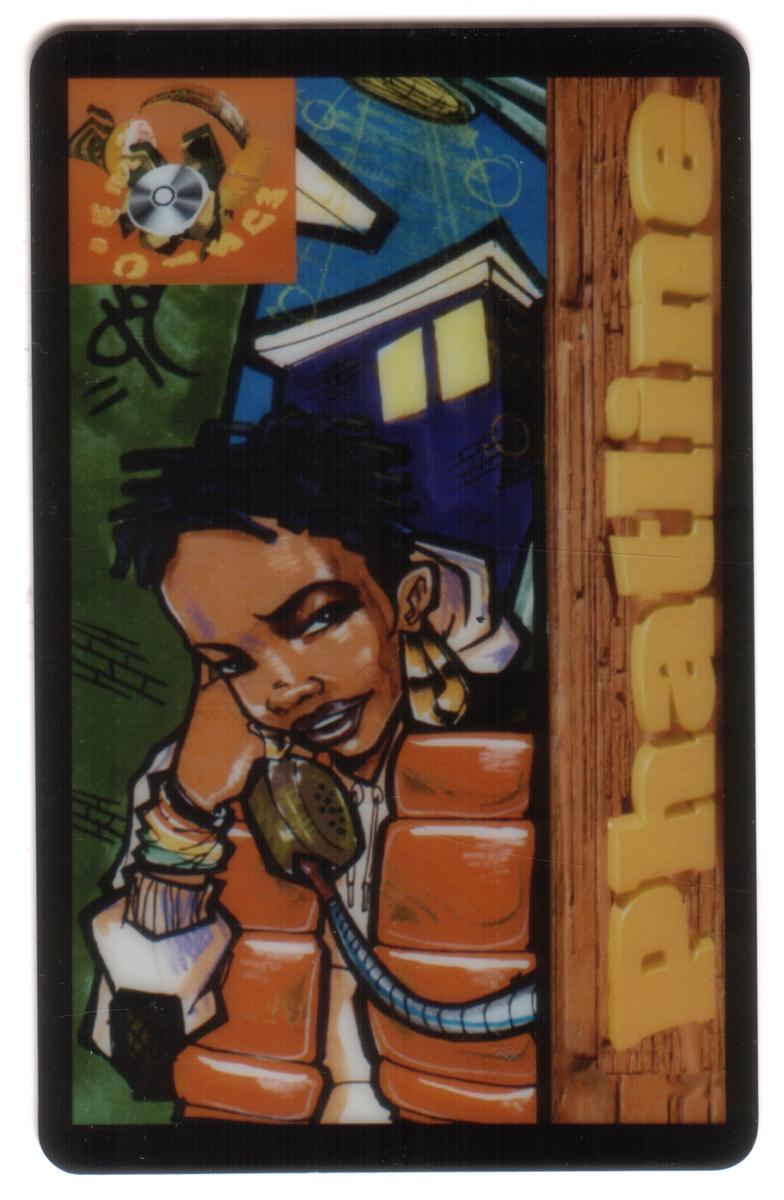 The card’s design incorporates the words “Phat Connect: Music,” “Celebrity,” “Rap,” and “Rhythm,” clearly highlighting the card’s connection to music and entertainment. Additionally, the presence of telephones integrated into the design reinforces its identity as a phone card. The brand “Phatline” is referenced twice, linking the collectible to a specific series or concept focusing on rap stars and musicians.