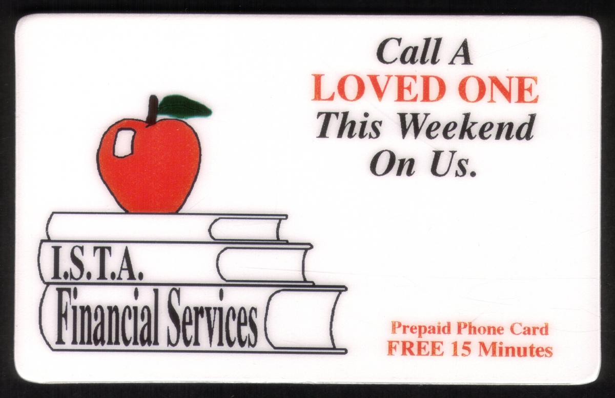 This collectible promotional business card prominently features the logos and trademarks of i.s.t.a. and ISTA Financial Services. The card highlights a connection to “Innovative Telecom” with bold text emphasizing “Call A Loved One.” The design incorporates the Apple logo and a Books icon, indicating an association with Apple & Books services or products. The overall layout positions the ISTA Financial Services branding near the top left, with i.s.t.a. logo situated nearby, linking the card to these organizations.