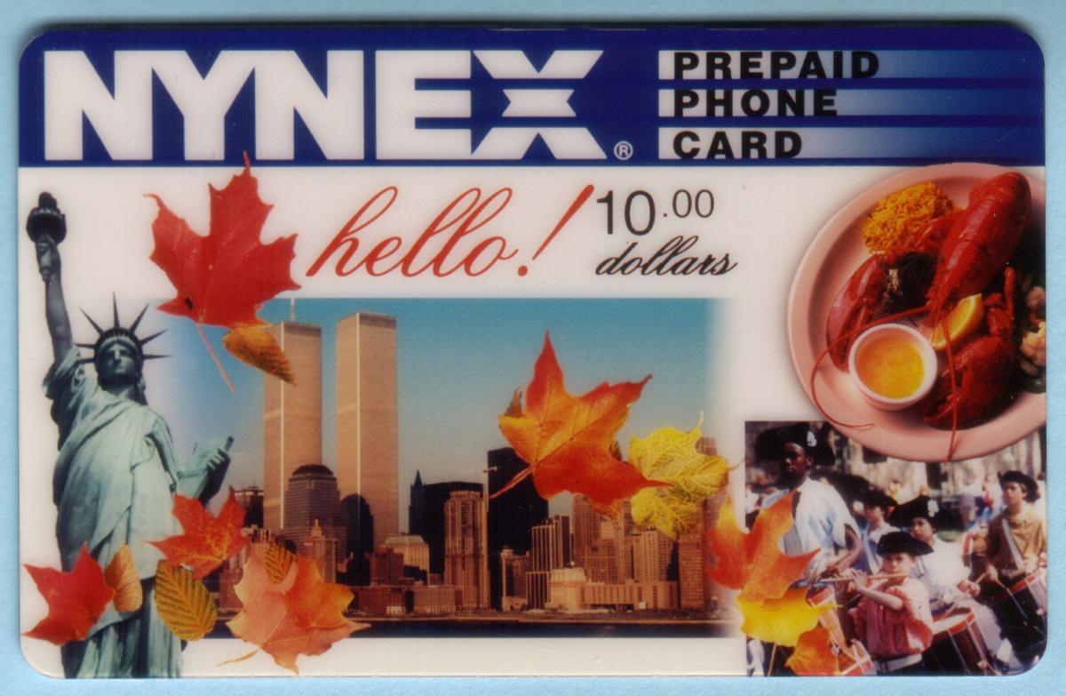 NYNEX $10 prepaid card featuring NYC landmarks, Statue of Liberty, Canadian maple leaf, autumn leaves, seafood, and musical scenes, symbolizing connection and culture. |