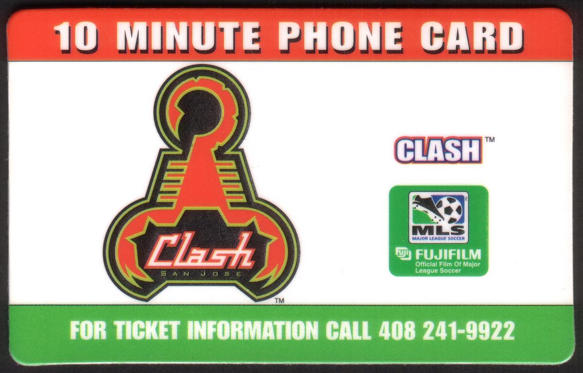 This collectible phone card features the San Jose Clash logo, representing the Major League Soccer (MLS) team based in California. The card highlights the sport of soccer, also known as futbol or fotboll, connecting to the 10-million mark milestone within MLS. The San Jose Clash logo is prominently displayed, showcasing the team’s brand identity. The card is produced in association with Innovative Telecom ITC and FujiFilm, indicating a promotional collaboration.