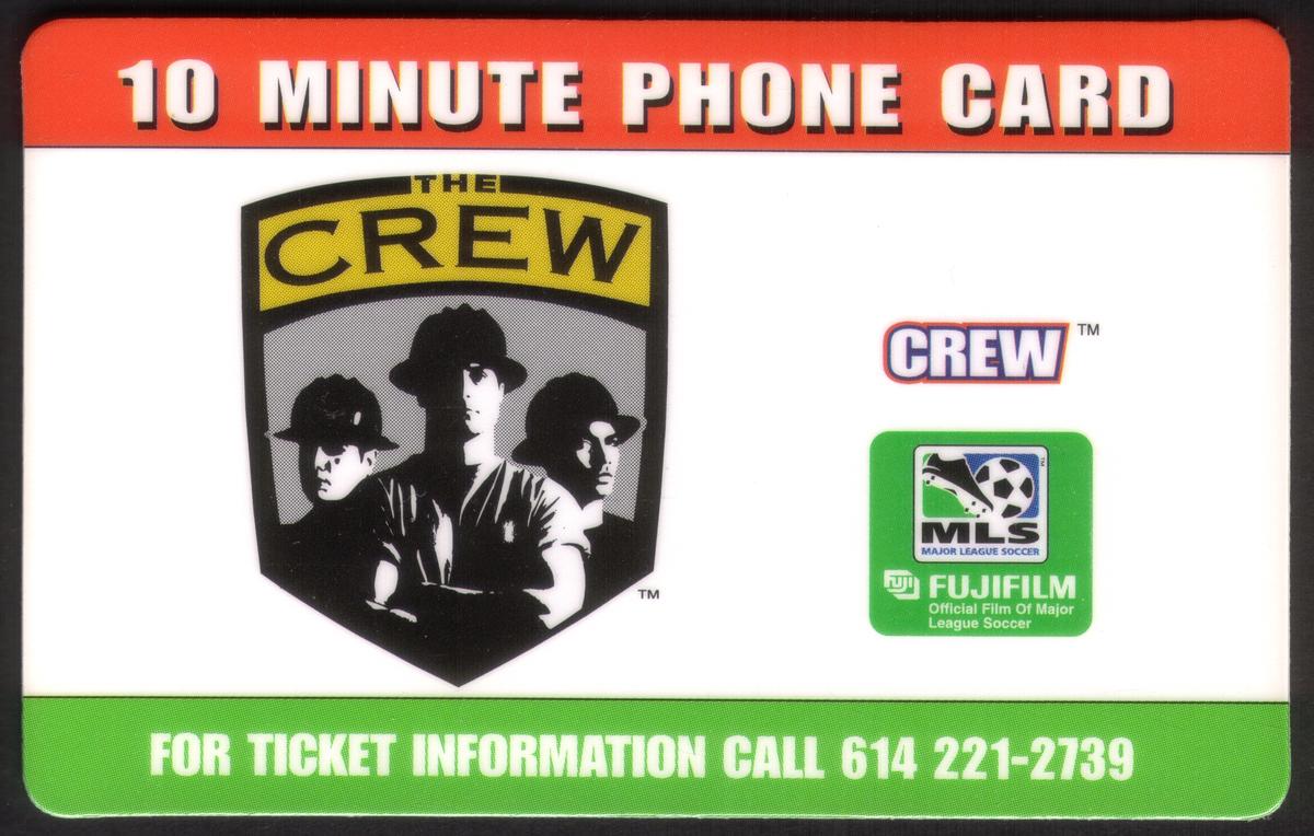 This collectible phone card features the Columbus Crew logo prominently in the center against a white background. The Columbus Crew logo consists of a stylized black and yellow shield with three stars above it, representing the Major League Soccer (MLS) team. Surrounding the shield is a thin yellow border, and the text "COLUMBUS CREW" is included below the shield in black lettering.
