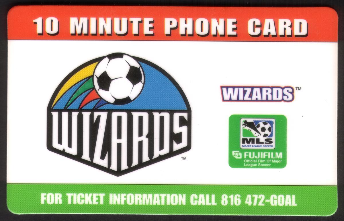 This collectible phone card showcases the Kansas City Wizards logo prominently in the lower left corner. The logo features a circular design with a soccer ball at its center and a blue and gold color scheme, representing the Major League Soccer team. The background of the card displays a photo of a soccer player wearing a white uniform with the number 7 visible on his shorts and a captain's armband on his left arm. The player is in mid-action, about to kick a soccer ball on a green field under daylight.