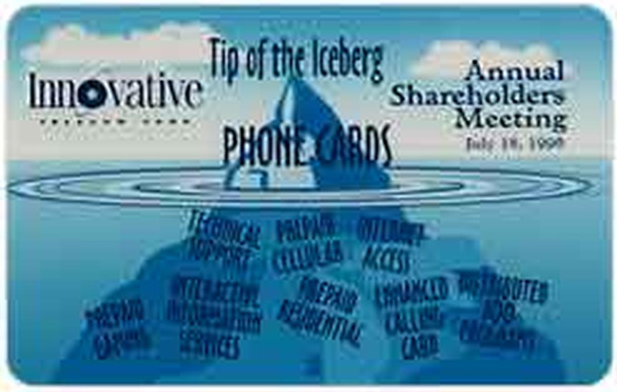 The card is dated from 1996 and is clearly intended for business or promotional use linked with Innovative Telecom. The colors of the card include shades of blue and white, with graphical elements that complement the "Iceberg" concept. The overall layout is clean and professional, emphasizing its function as a collectible linked to a corporate shareholders meeting.
