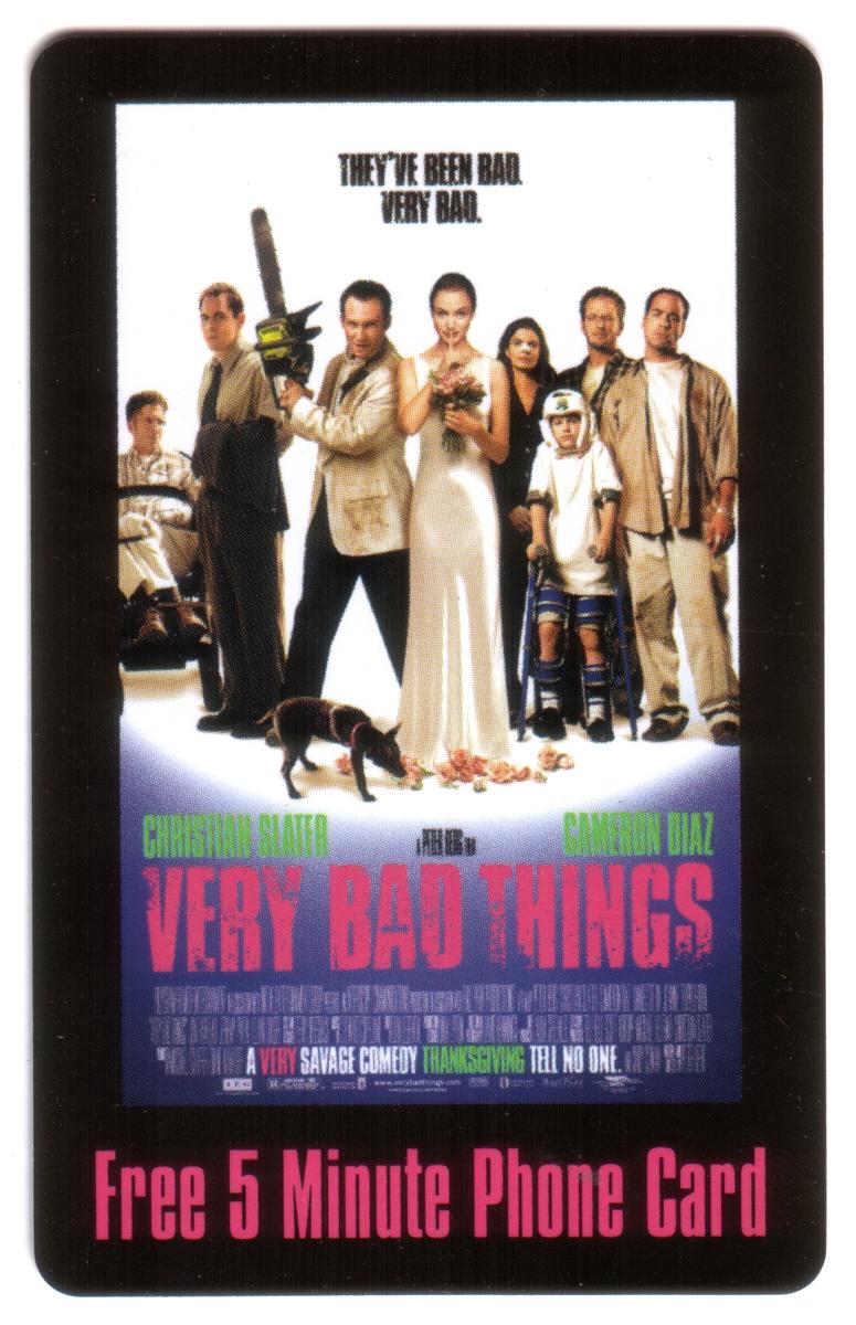Produced by Innovative Telecom, the card is part of a collectible series dedicated to entertainment and movie stars. The words "5m Very Bad Things Movie" appear clearly, indicating the phone card’s value and reference to the film. The card also includes the official logo and branding of Innovative Telecom, confirming its origin and authenticity. Overall, this collectible phone card serves as a tribute to the 1998 film starring Christian Slater and Cameron Diaz, combining recognizable imagery and thematic elements from the movie.