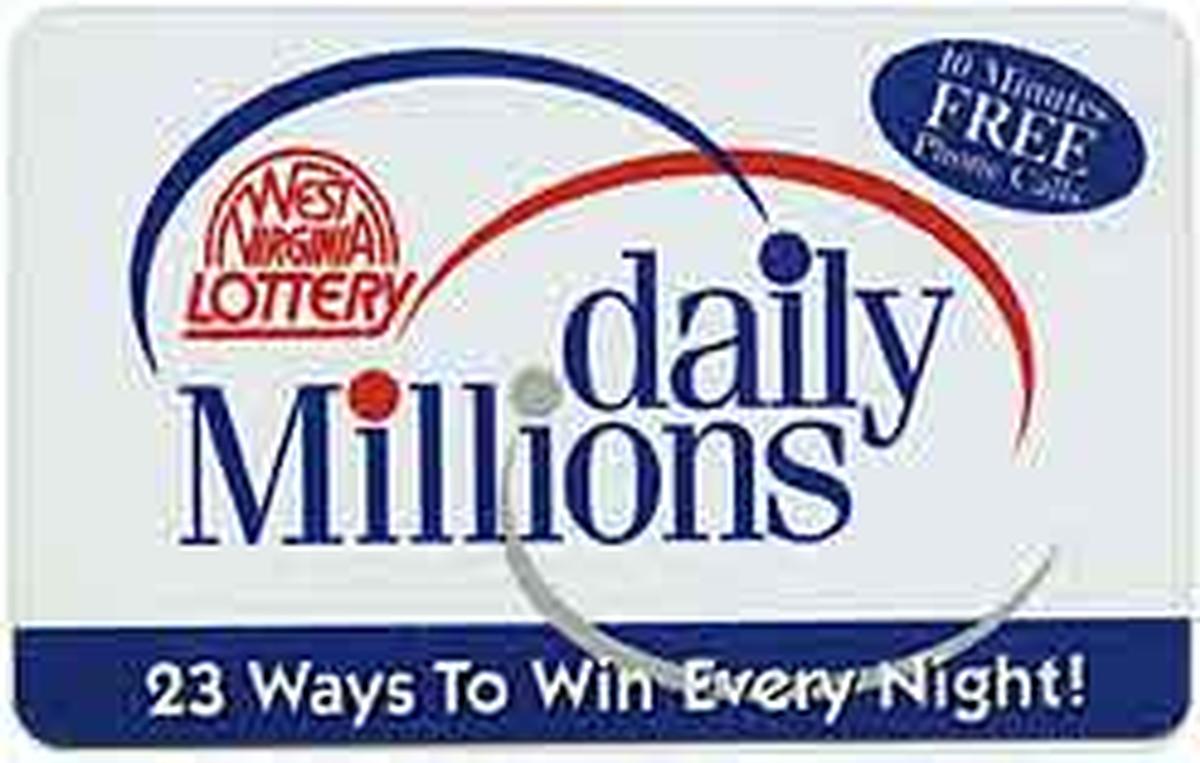 This collectible phone card is a promotional specimen issued by the West Virginia Lottery for the “Daily Millions” competition. The card features the distinctive West Virginia Lottery logo positioned prominently near the top right, with the words "Daily Millions" clearly displayed beneath it. The West Virginia Lottery emblem includes the outline of the state with a colorful design, and the card emphasizes its promotional nature with the text "Comp. Promo SPECIMEN" near the upper left side.