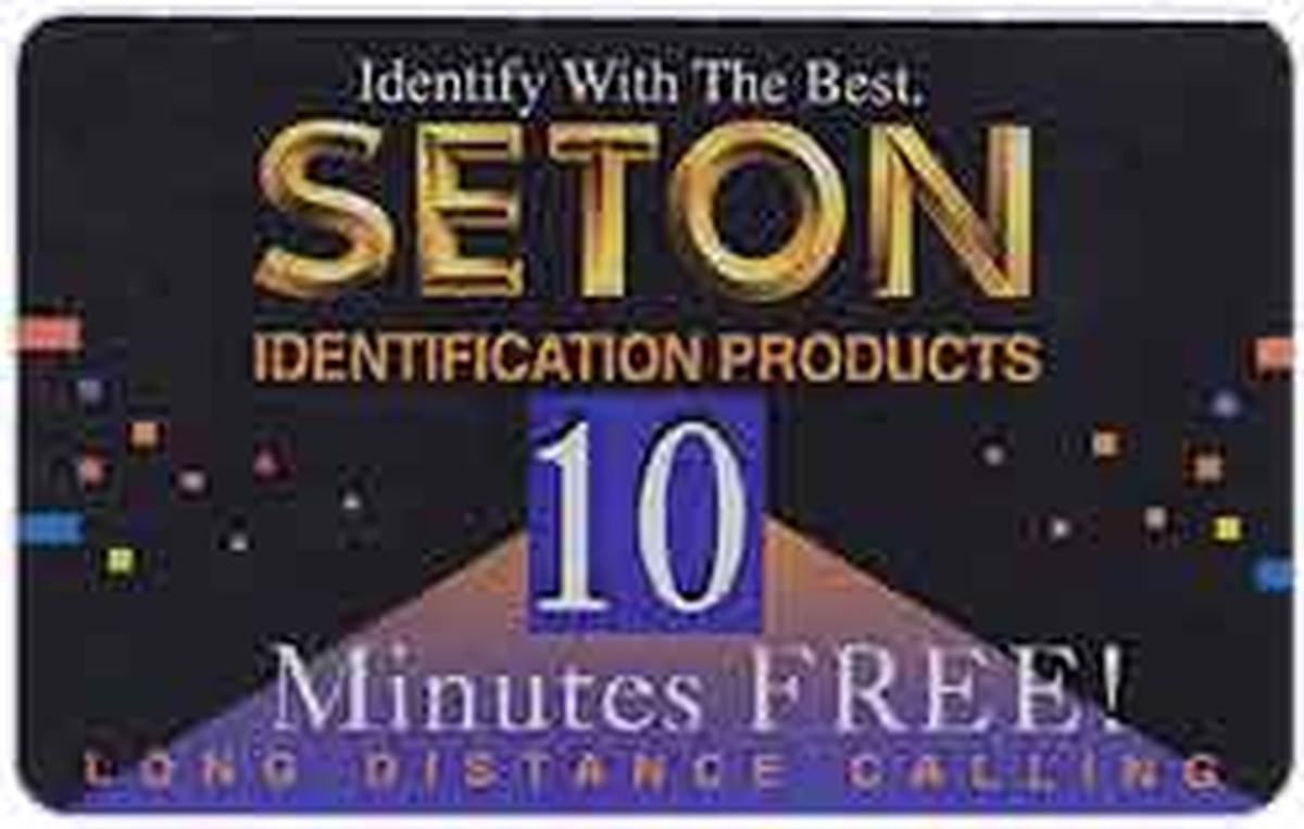 This collectible promotional phone card features the logos and trademarks of Seton Identification Products and Innovative Telecom. It is a 10-meter phone card issued as a complimentary promotion. The card prominently displays the Seton Identification Products logo on the left side, with “Complimentary Promotion” text nearby. To the right, the Innovative Telecom logo is visible, including a stylized globe design and the company’s name in clear, bold letters.
